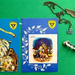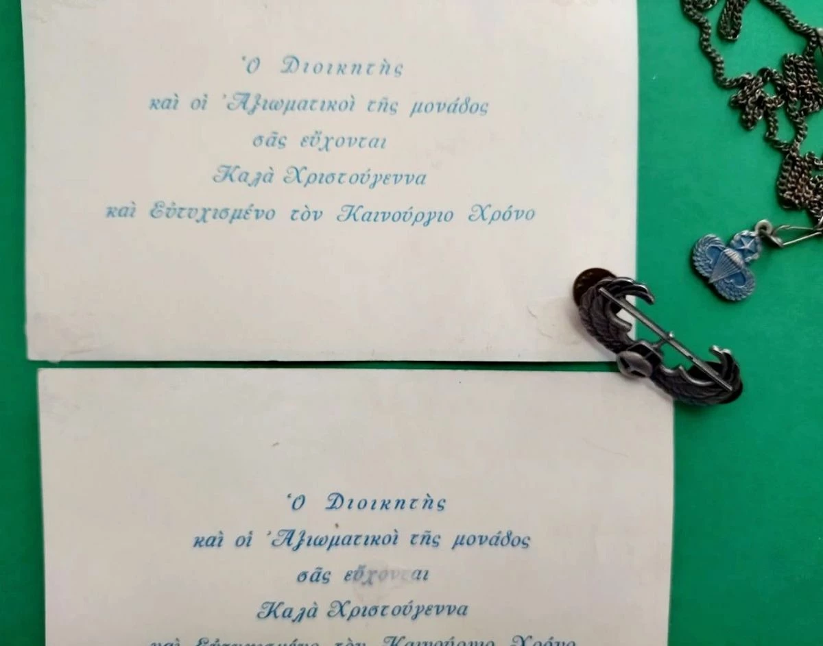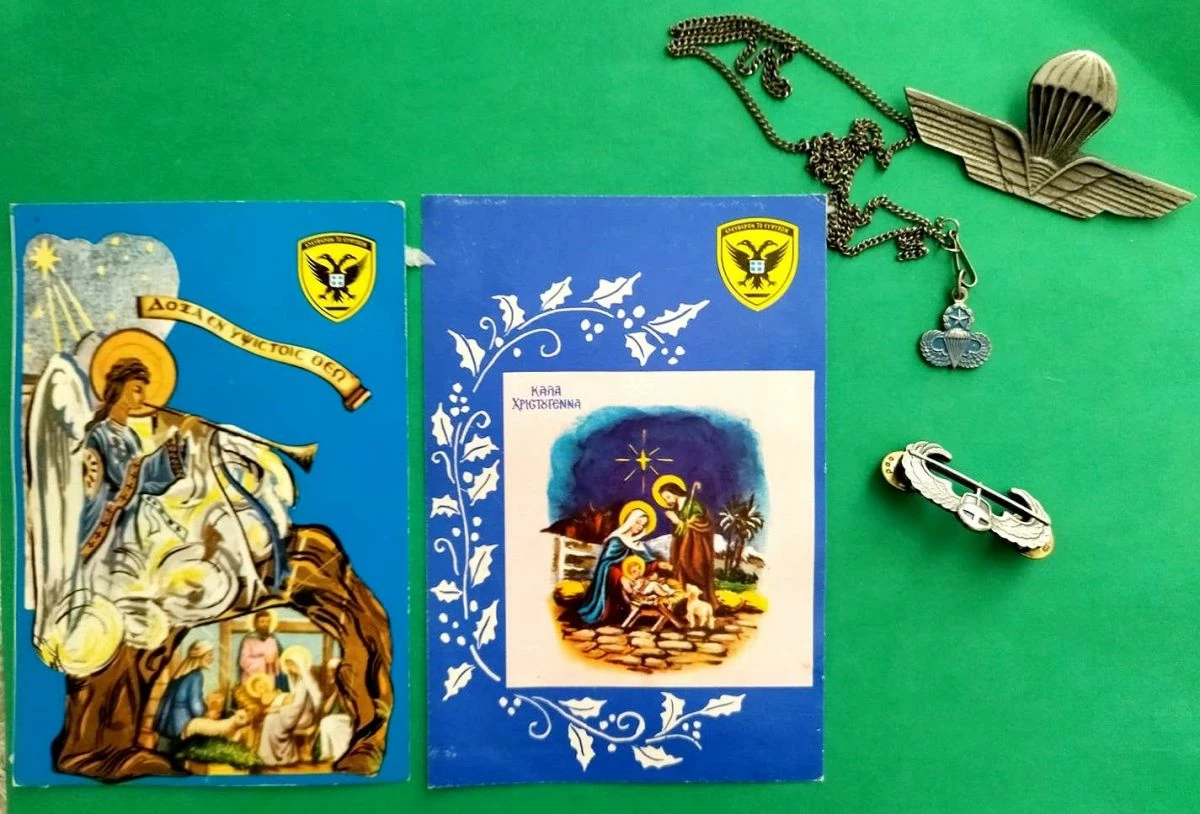 2 παλιες ευχετηριες καρτες Πολεμικης Αεροποριας , 2 πουλαδες καρφιτσες κ μια κρεμαστη