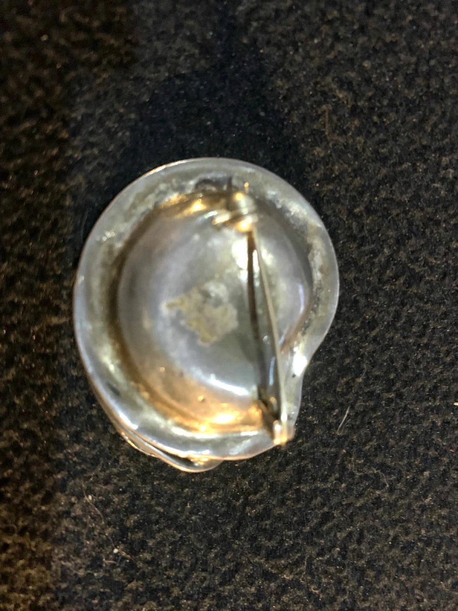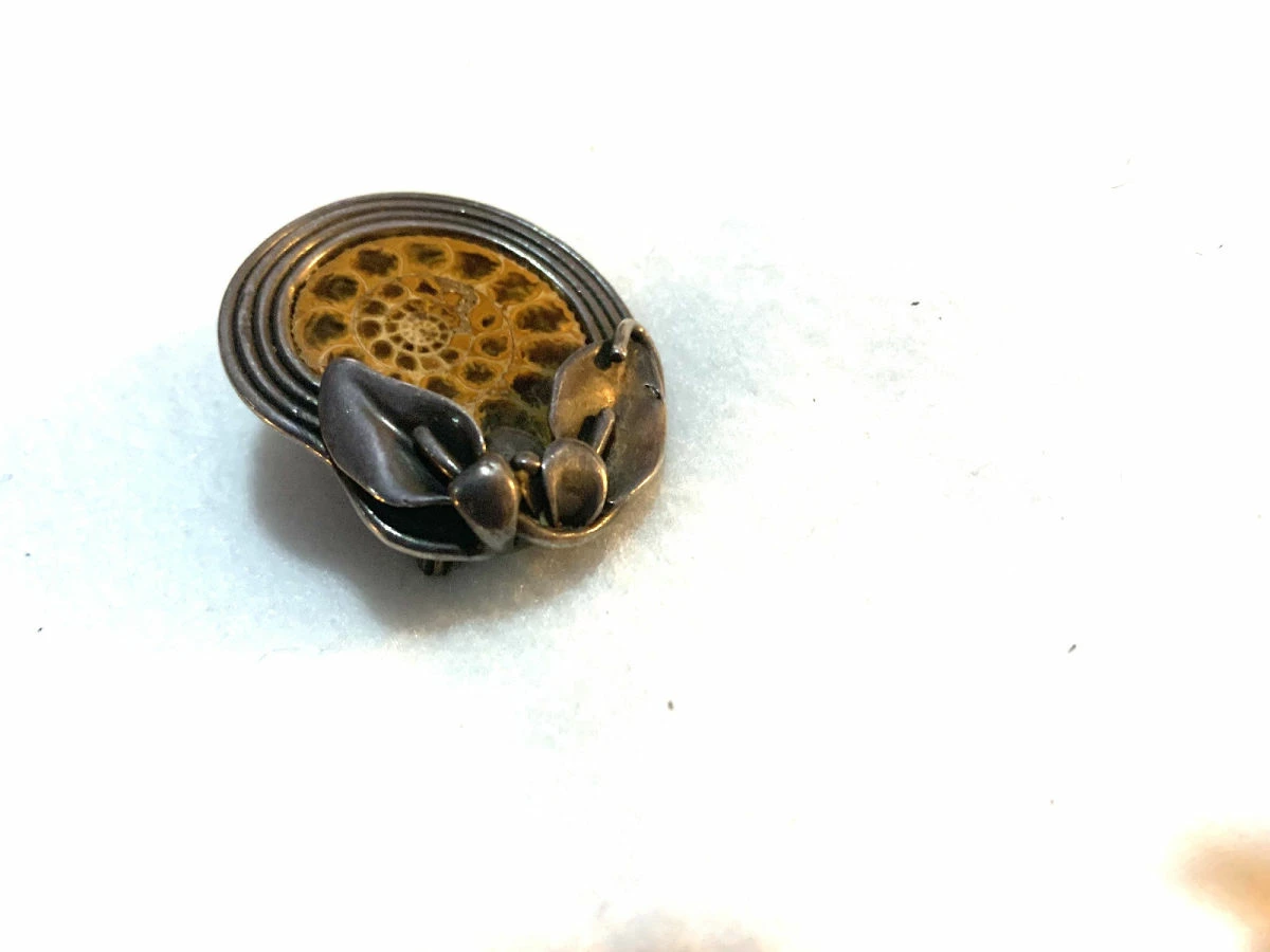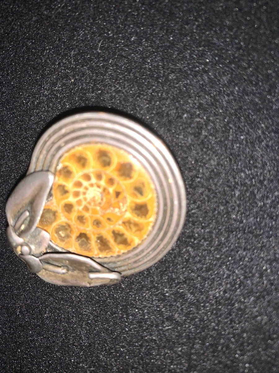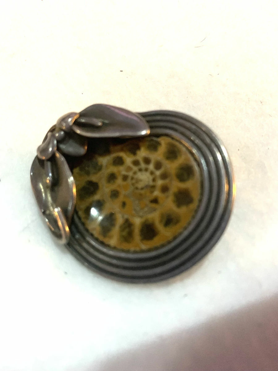 Πρόκειται για πολύ παλιό και ξεχωριστό κομμάτι από τα οικογενειακά κοσμήματα. Απολιθωμένο σαλιγκάρι με πανέμορφο ασημένιο δέσιμο 925* σε καρφίτσα με κούμπωμα ασφαλείας. Δεν αποστέλλεται με ταχυδρομείο. Συνάντηση από κοντά.