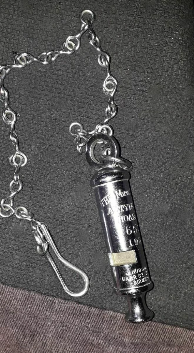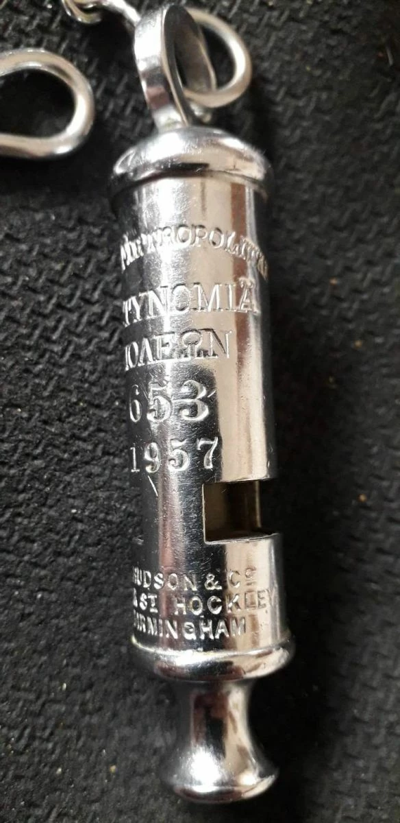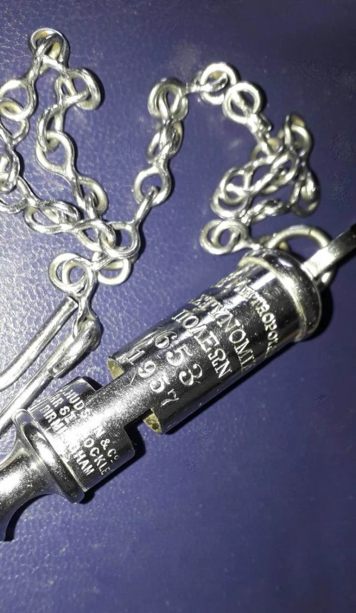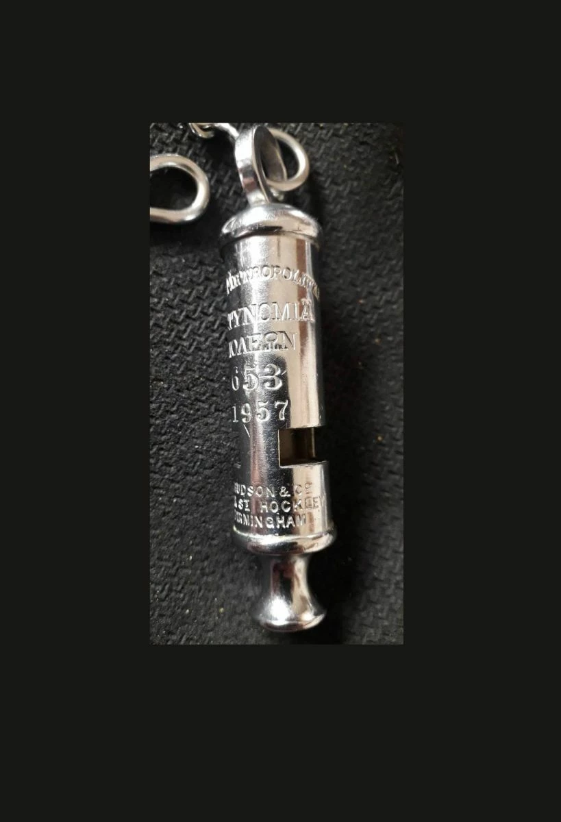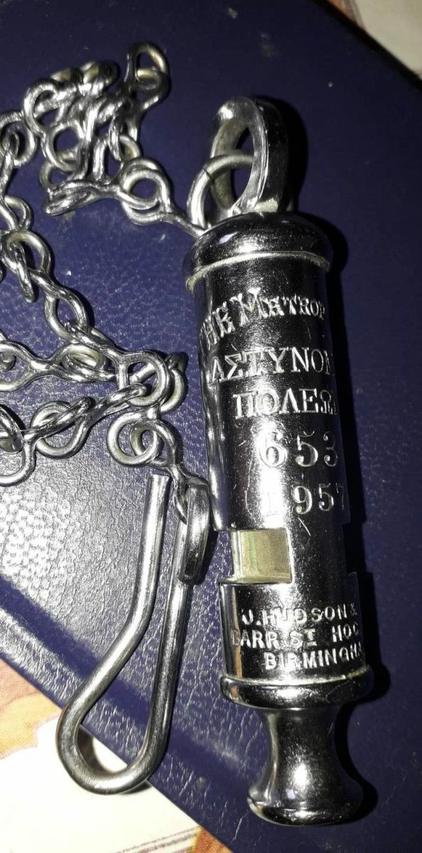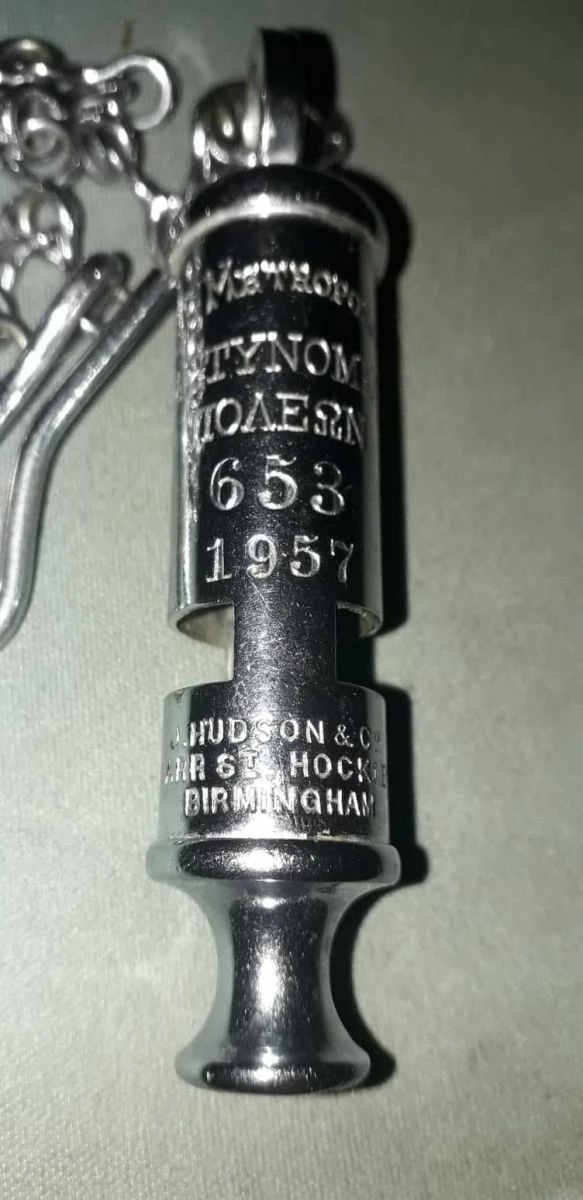 Αυθεντική σφυρίχτρα Αστυνομίας Πόλεων του 1957 πλήρης, με την αλυσίδα της, σε εξαιρετική κατάσταση.