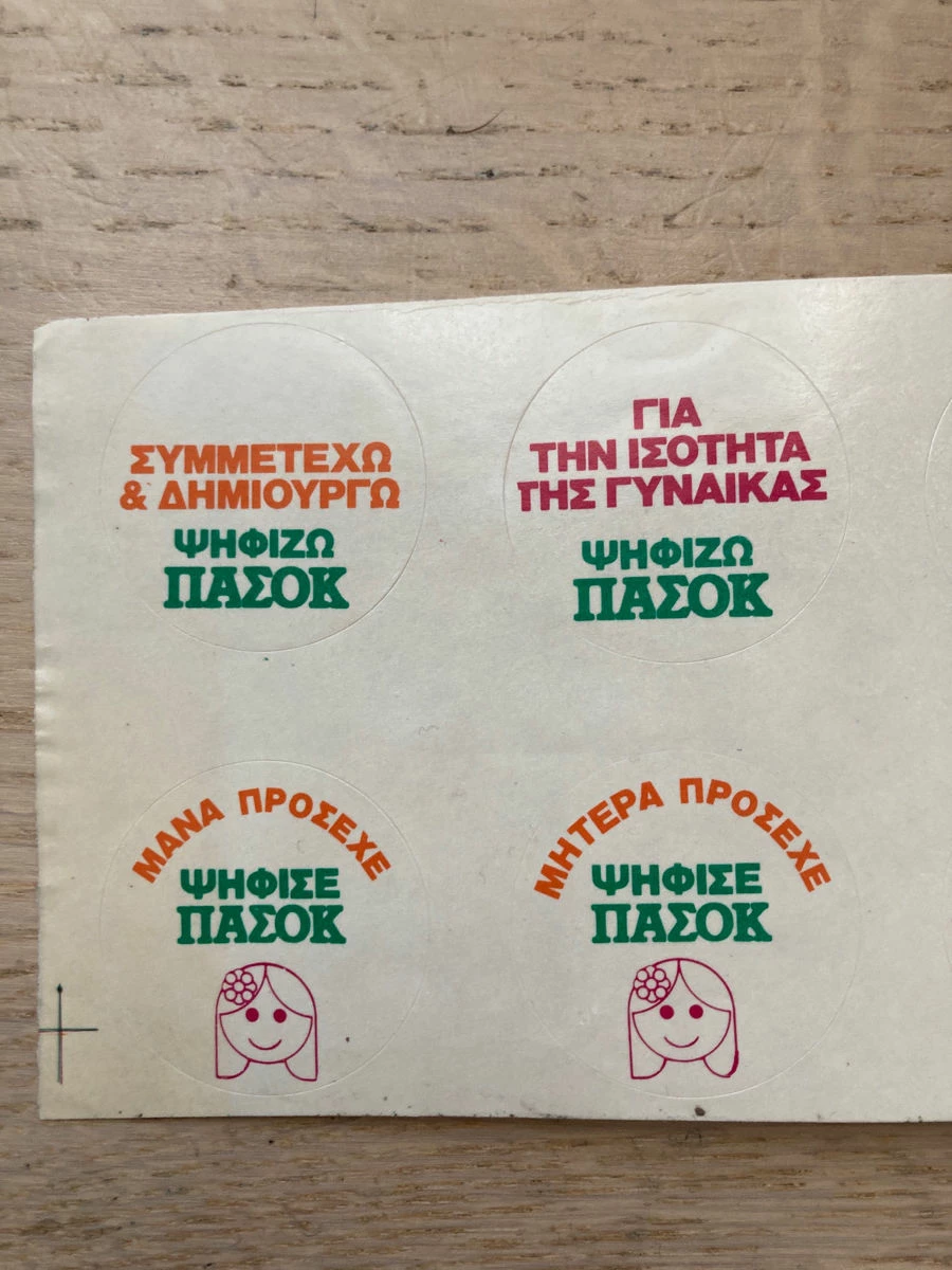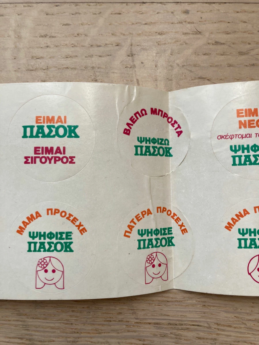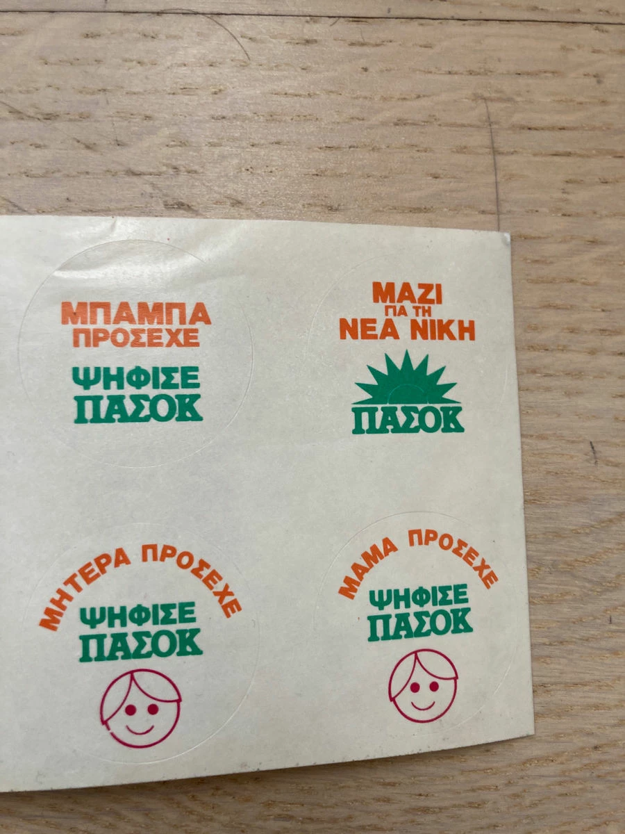 Συλλεκτική, καρτέλα με 14 κυκλικά αυτοκόλλητα διαμέτρου τεσσάρων cm, προπαγάνδας – διαφήμισης του ΠΑΣΟΚ δεκαετίας 1980.