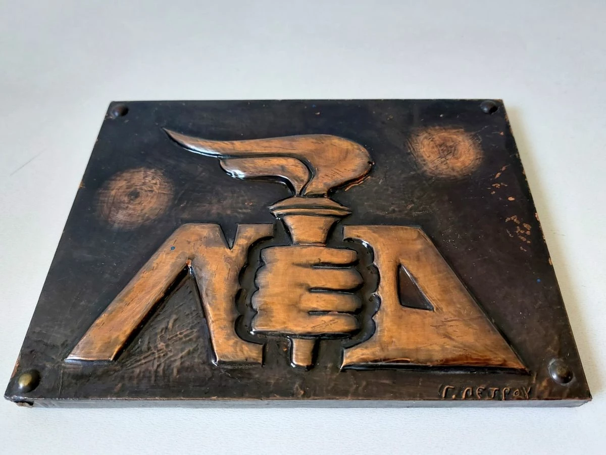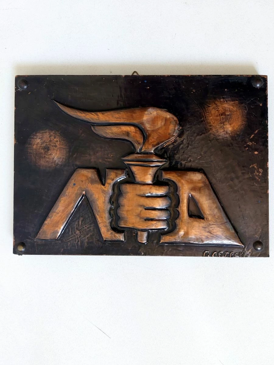Πολιτικό κόμμα, Νέα Δημοκρατια. Χειροποίητο υπογεγραμμένο κάδρο εποχής. Υλικό: Χαλκός και ξύλο. Διαστάσεις κατά προσέγγιση 23×17.