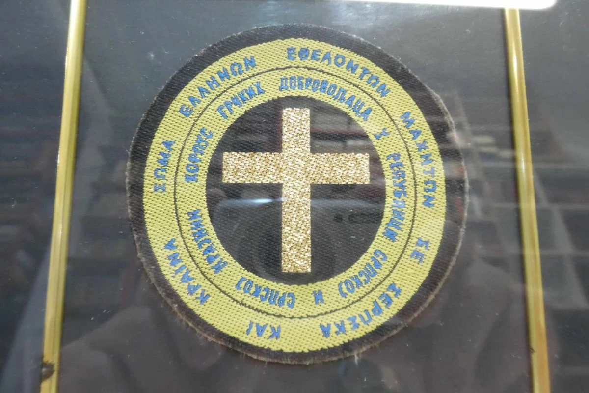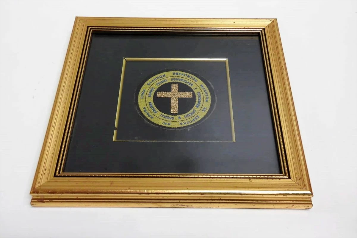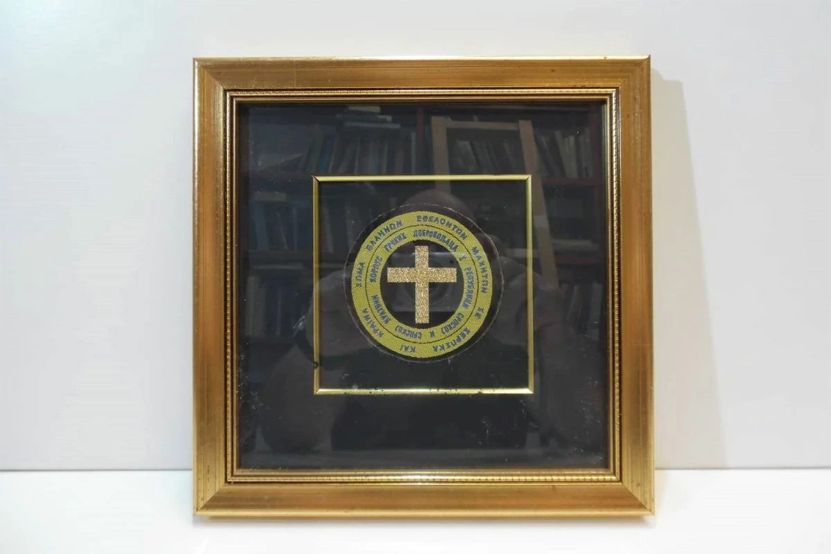 Χρυσοκέντητο ραφτό σήμα σε κορνίζα ,του ελληνικού σώματος εθελοντών μαχητών σε ΣΕΡΠΣΚΑ και ΚΡΑΙΝΑ κατά την διάρκεια του εμφυλίου στη Γιουγκοσλαβία κατά τη δεκαετία του 90.