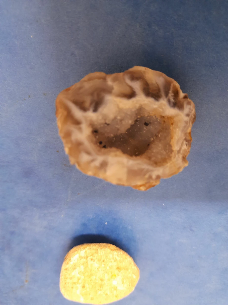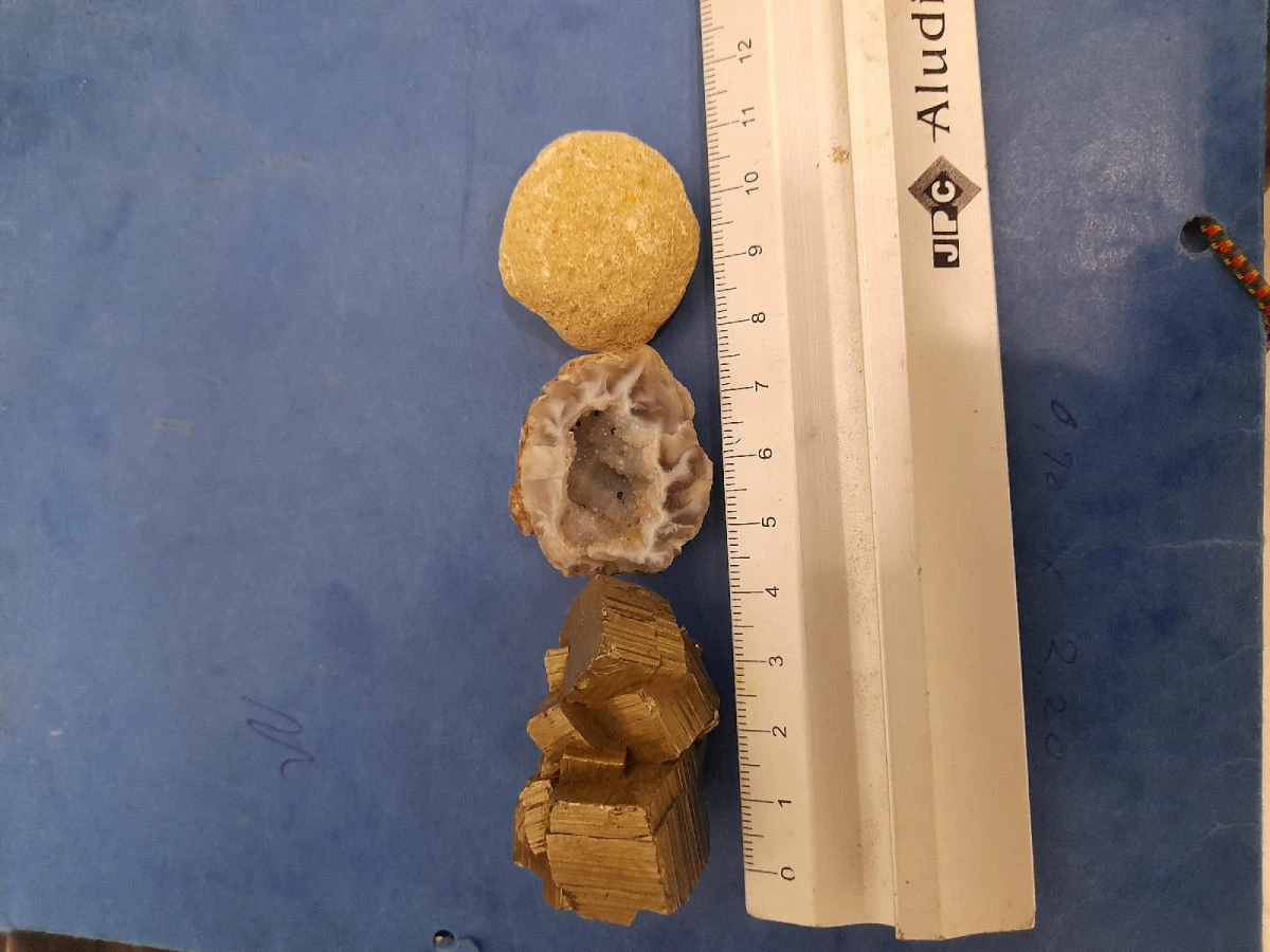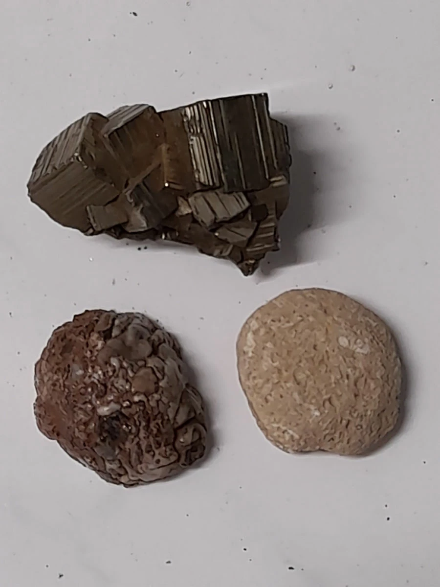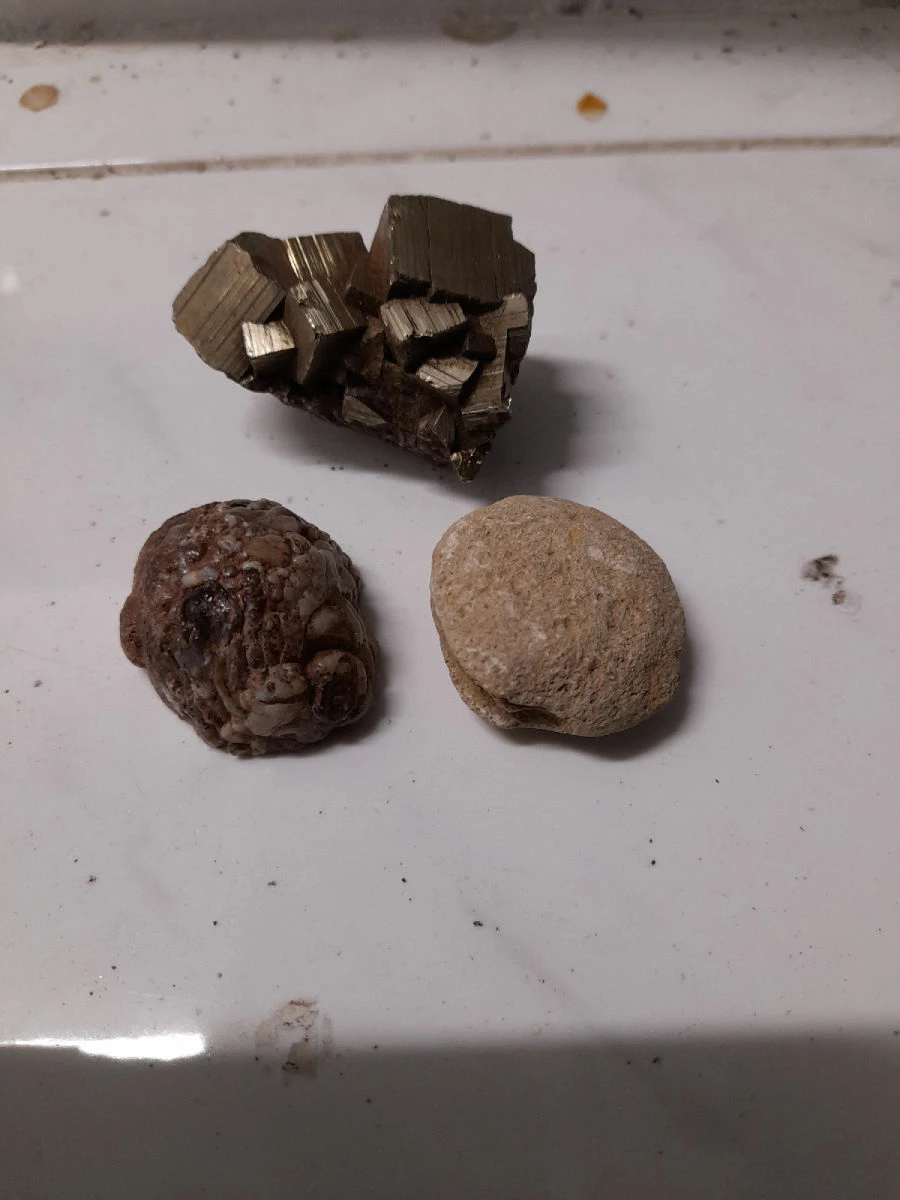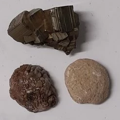 είναι σιδηροπυρίτης με κρυστάλλους κύβους ένας αχάτης και ένα απολίθωμα όστρακο