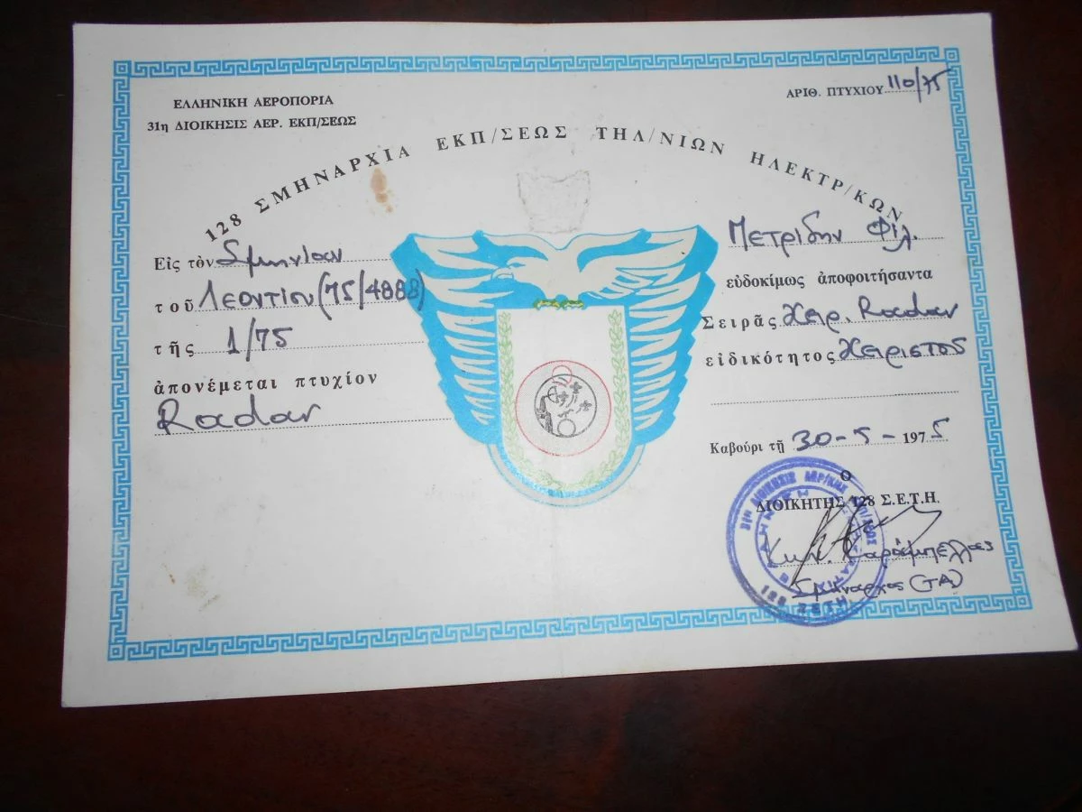 ΕΛΛΗΝΙΚΟΣ ΣΤΡΑΤΟΣ -1975 ΠΤΥΧΙΟ ΧΕΙΡΙΣΤΗ ΡΑΝΤΑΡ ΑΕΡΟΠΟΡΙΑΣ
