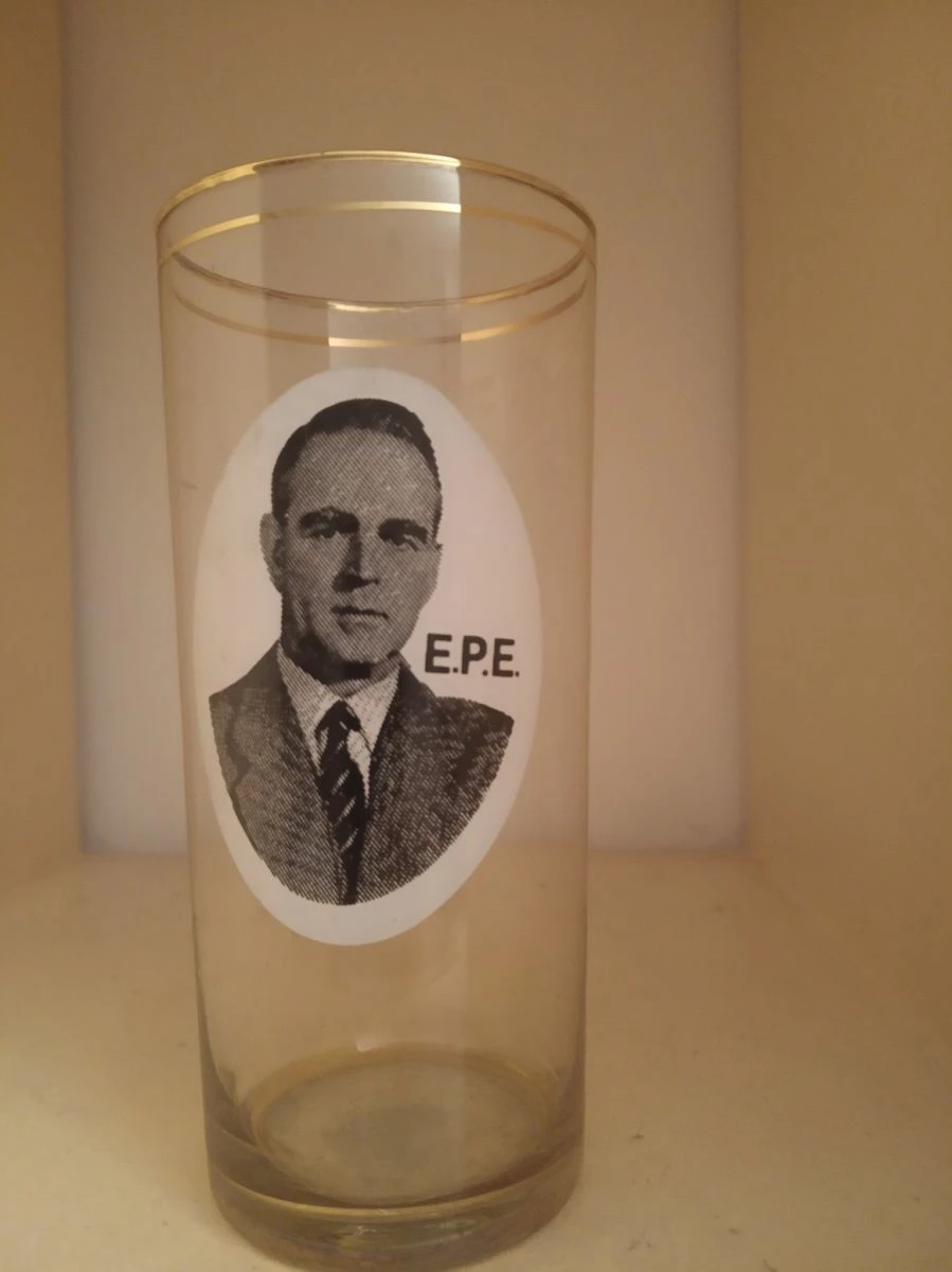Πωλείται το εικονιζόμενο ποτήρι εποχης, της ΕΡΕ, με τον “Θείο”. Ύψος 13 εκ και σε άριστη κατάσταση.