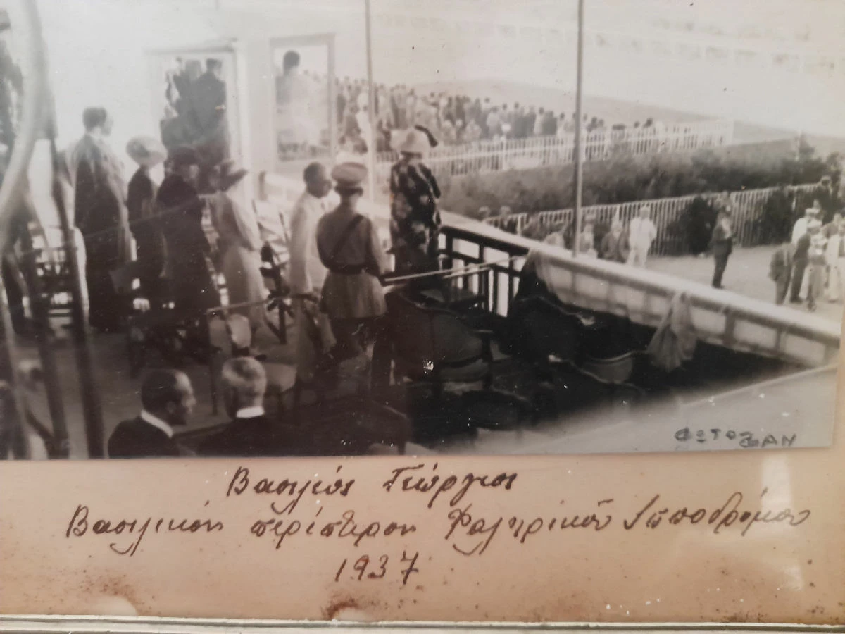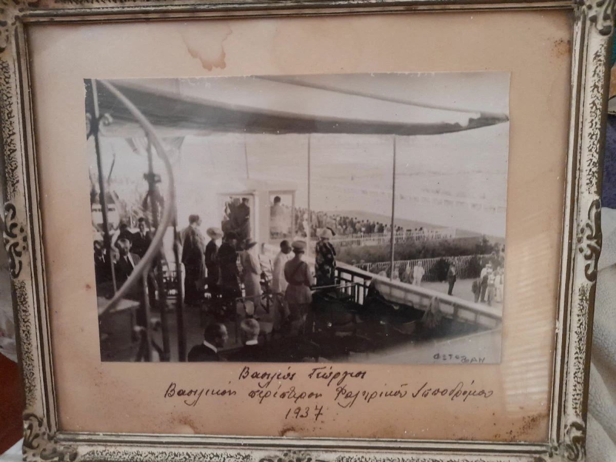 Κορνίζα εποχής με φωτογραφία του Βασιλιά Γεωργίου στο Βασιλικό Περίπτερο του Φαληρικού Ιπποδρόμου του 1937.Το χαρτί στο πίσω μέρος έχει φθορά βλέπετε φωτογραφία.