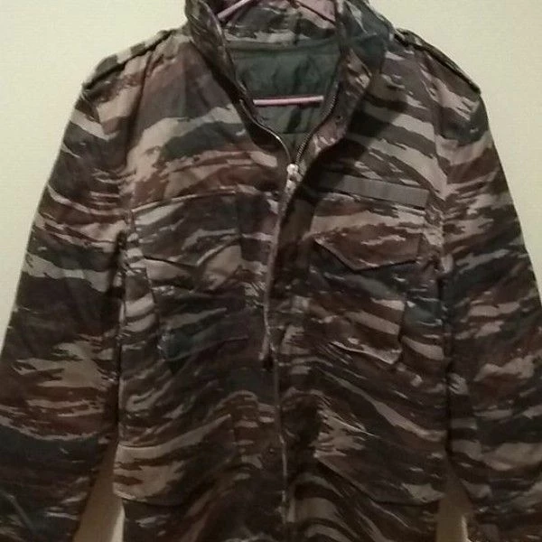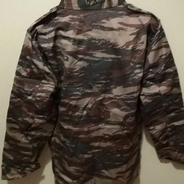 Στρατιωτικό τζάκετ γνήσιο Ελληνικού Στρατού (ΕΣ), αφόρετο, με αφαιρούμενη εσωτερική επένδυση, μια κουκούλα κρυμμένη στο γιακά, τέσσερις τσέπες μπροστά, μέγεθος S.