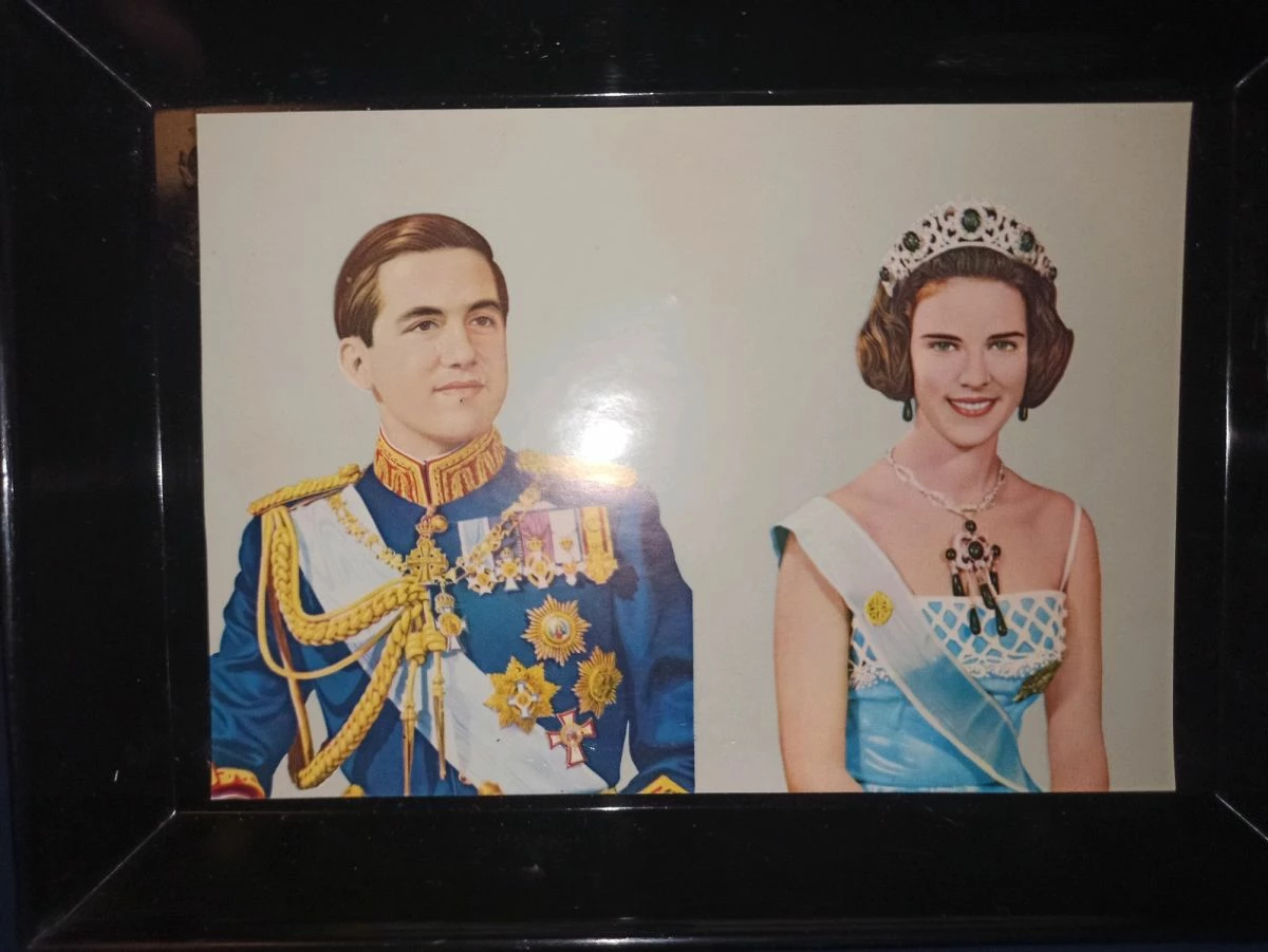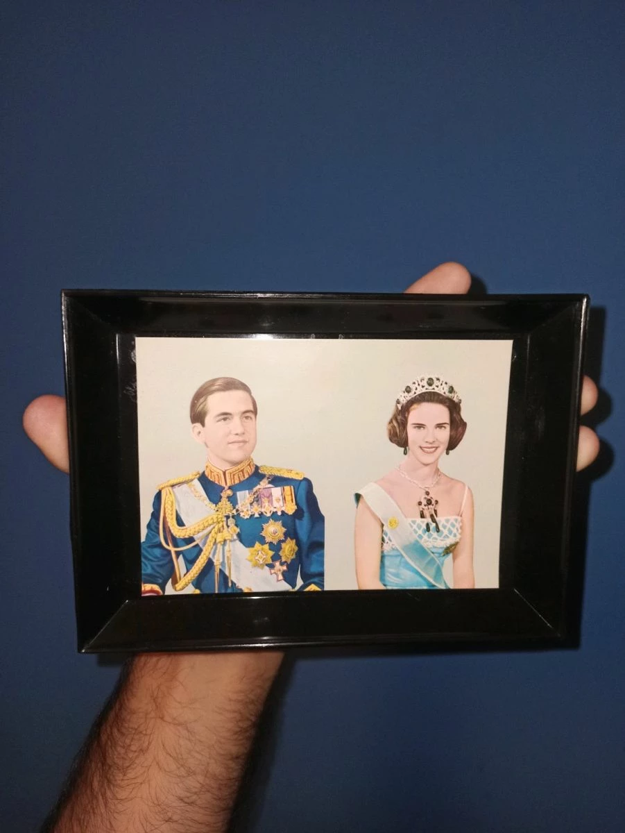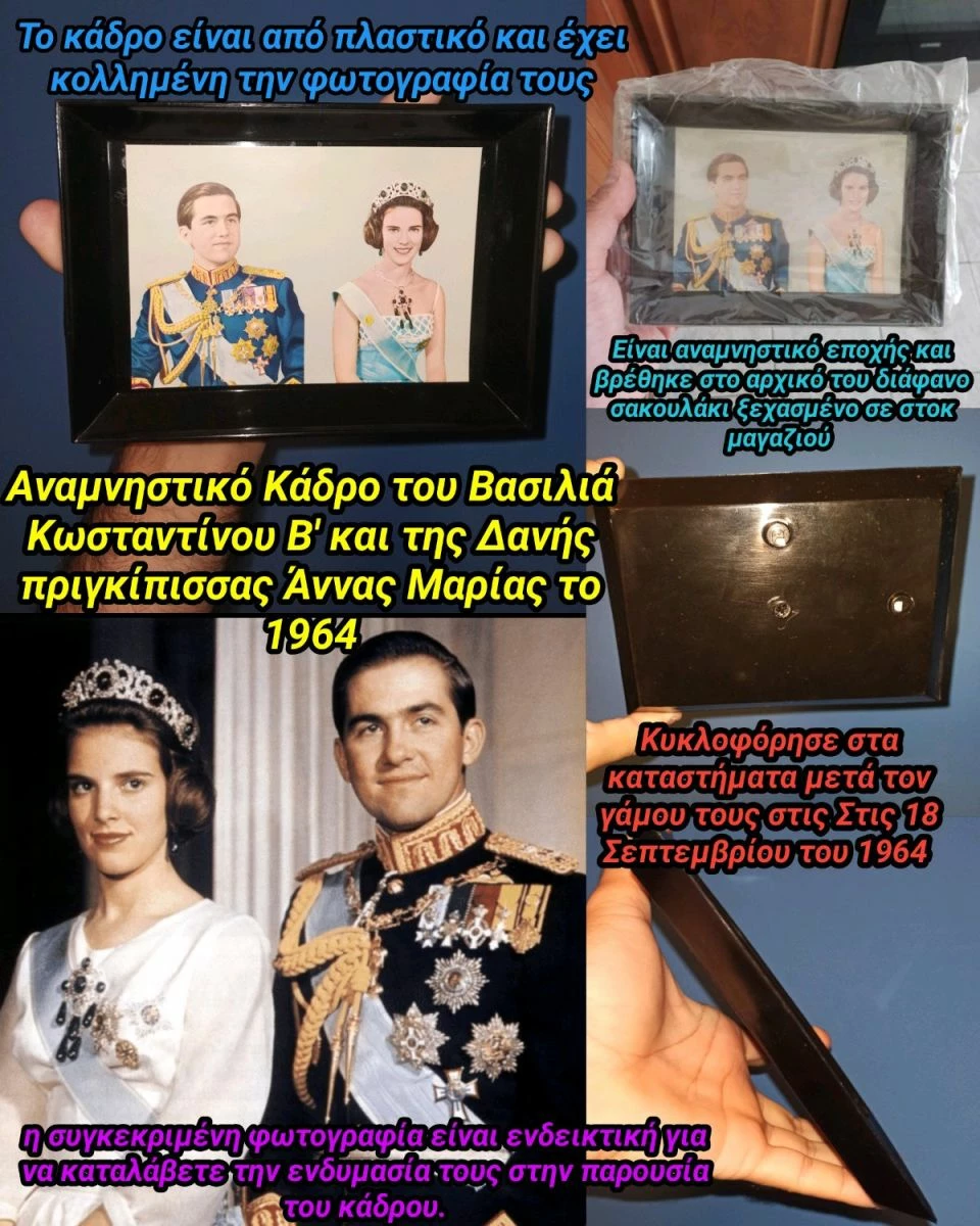 Πωλείται ένα Πλαστικό κάδρο με κολλημένη την φωτογραφία του Βασιλιά Κωσταντίνου Β’και της Δανής πριγκίπισσας Άννας Μαρίας από τον γάμο τους στις 18 Σεπτεμβρίου του 1964 στην Αθήνα.Το συγκεκριμένο κάδρο το πουλούσαν συγκεκριμένα καταστήματα την εποχή εκείνη ως αναμνηστικό, βρέθηκε ξεχασμένο σε στοκ μαγαζιού στο αρχικό του διάφανο σακουλάκι,δεν έχει χρησιμοποιηθεί ποτέ και είναι σε καλή κατάσταση για τα χρόνια του.Στην πίσω πλευρά έχει υποδοχές για να σταθεί σε τοίχο. Πωλείτε καθαρά ως αναμνηστικό Ιστορικό αντικείμενο και καμιά σχέση με πολιτικές πεποιθήσεις η οποιαδήποτε άλλη παράταξη. Αντικειμενικά είναι ένα σπάνιο έκθεμα και σίγουρα ότι καλύτερο για σχετικές συλλογές! Παρακαλώ δείτε όλες τις φωτογραφίες που έχω ανεβάσει εάν επιθυμείτε περισσότερες η οποιαδήποτε πληροφορία ενημερώστε με σε πμ.
