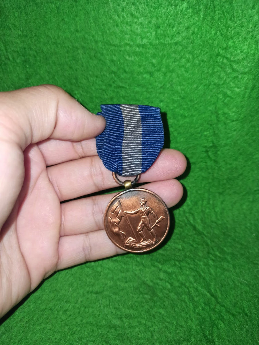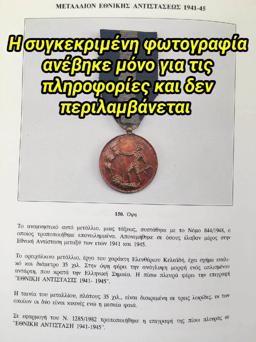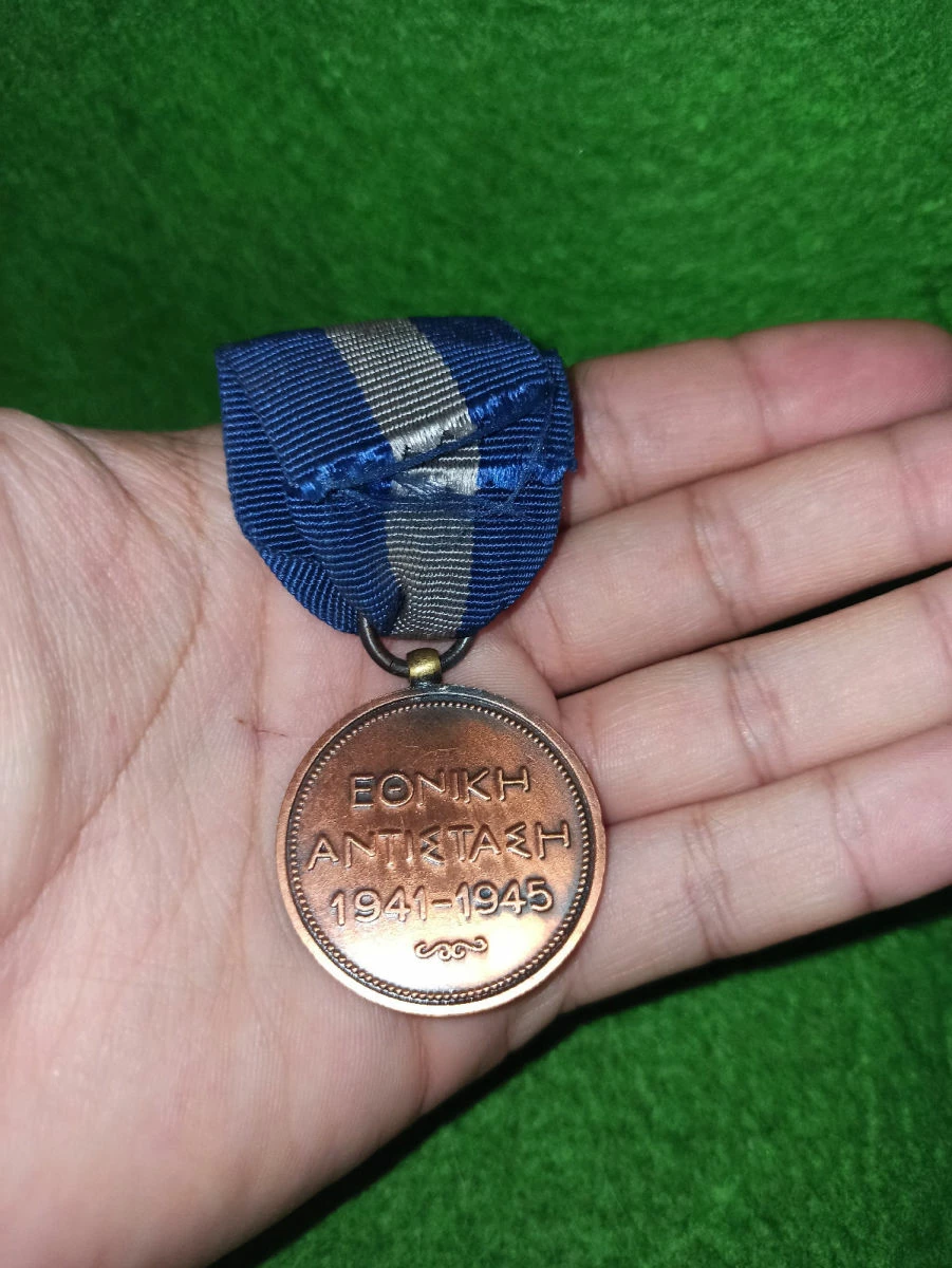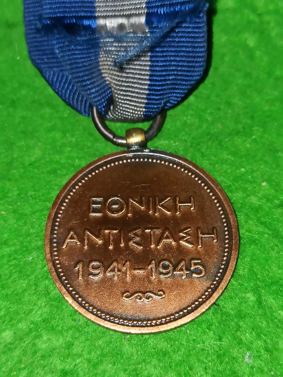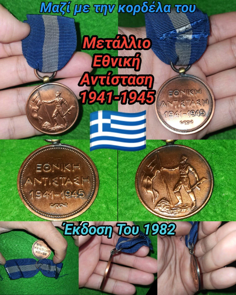 Πωλείται ένα αυθεντικό Ελληνικό μετάλλιο που δόθηκε από την Ελληνική κυβέρνηση το 1982(δεύτερη έκδοση)σε όσους πολέμησαν στην ΕΘΝΙΚΉ ΑΝΤΊΣΤΑΣΗ το 1941-1945 , φέρει μαζί και την κορδέλα του.Δειτε όλες τις φωτογραφίες που έχω ανεβάσει,εάν επιθυμείτε περισσότερες φωτογραφίες ή οποιαδήποτε πληροφορία ενημερώστε με σε πμ.Στις φωτογραφίες που ανέβασα υπάρχει και μια με αναλυτικές πληροφορίες από ένα σχετικό βιβλίο (δεν περιλαμβάνεται).