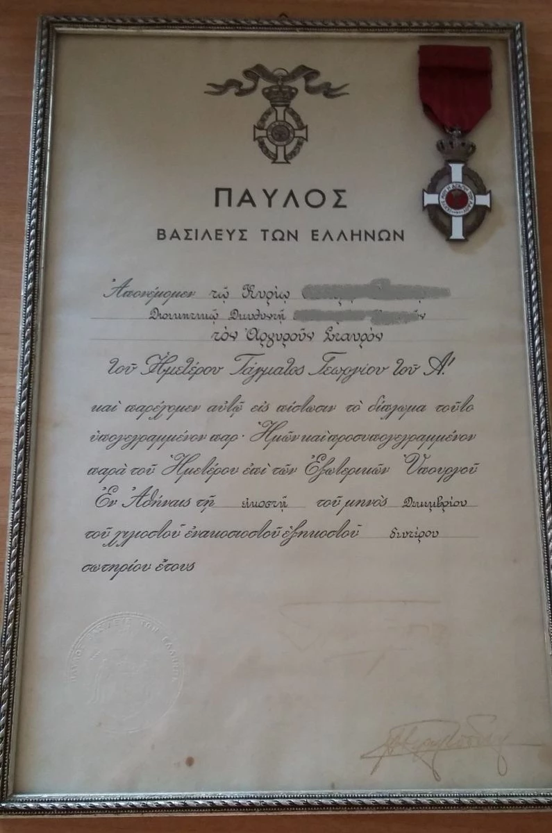 Αργυρός Σταυρός του Τάγματος Γεωργίου του Α’, ο οποίος απενεμήθη από τον Βασιλέα Παύλο το 1962, πωλείται μαζί με τη θήκη του.