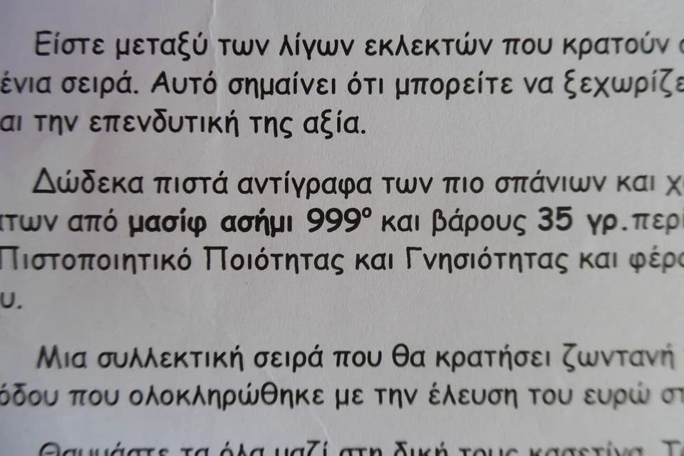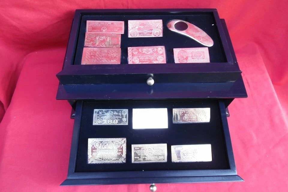 Τα 12 πιστά αντίγραφα χαρτονομισμάτων είναι από μασίφ ασήμι 999 βάρους 35 γρ έκαστο συνοδεύονται από Πιστοποιητικό Ποιότητας και Γνησιότητας και φέρουν ανάγλυφη την εικόνα του πρωτοτύπου.