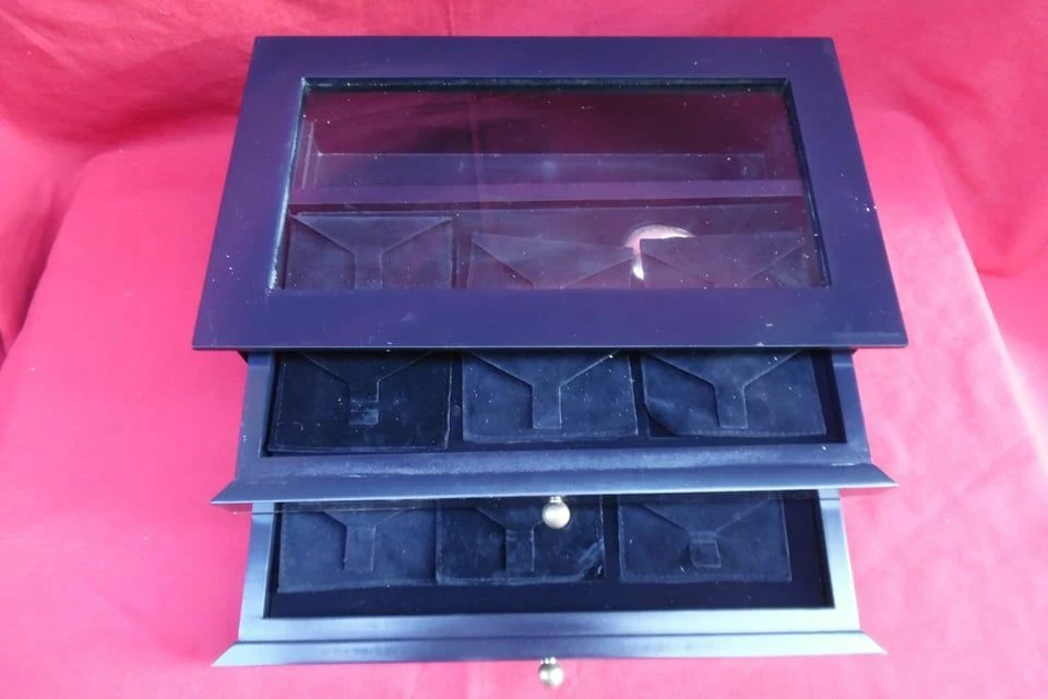 Σε πολυτελή διώροφη κασετίνα με βελούδινο εσωτερικό.