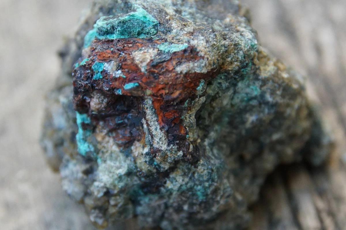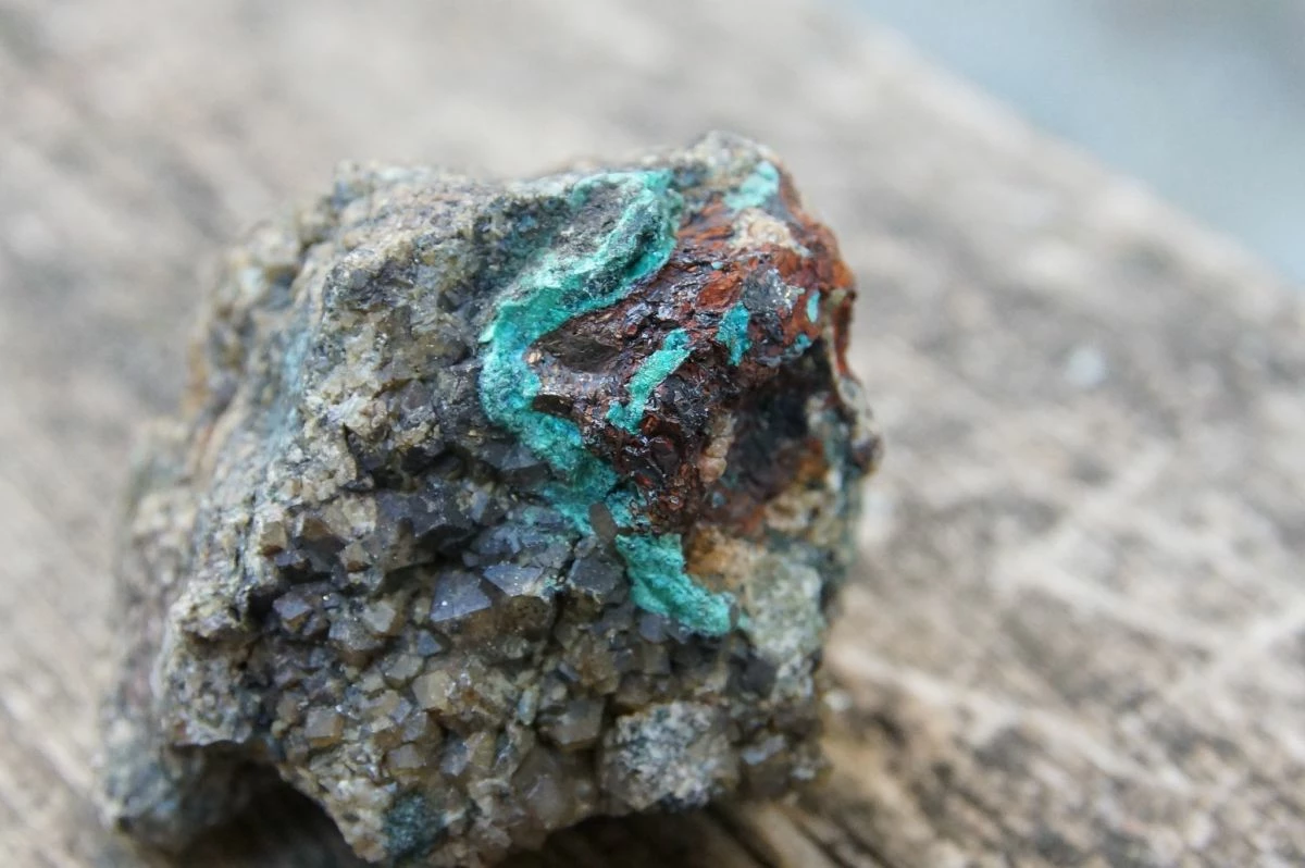 Ορυκτό απο βόρεια ελλάδα σύμπλαγμα με κρυστάλους γρανάτη, χρυσόκολλα , αιματίτη .Διαστάσεις 3 cm x 4 cm