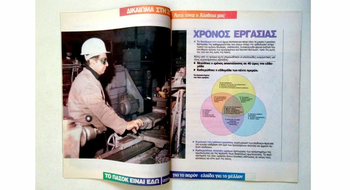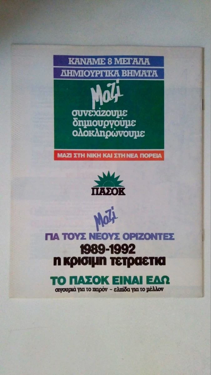 Άριστη κατάσταση, σαν καινούργιο. ΠΑΣΟΚ ” ΕΡΓΑΣΙΑ ” 1989 – 1992 . Προεκλογικό έντυπο εποχής. Ύψος φυλλαδίου 28 εκ. Πλάτος 21 εκ. Περιέχει 46 σελίδες.