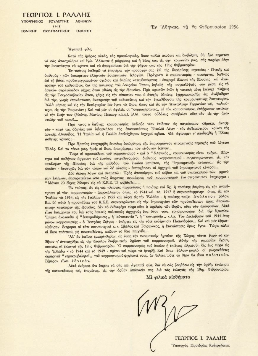 ΠΡΟΕΚΛΟΓΙΚΗ ΑΝΑΚΟΙΝΩΣΗ ΤΟΥ ΓΕΩΡΓΙΟΥ ΡΑΛΛΗ ΓΙΑ ΤΙΣ ΕΚΛΟΓΕΣ ΤΟΥ 1956..ΜΟΝΟΦΥΛΛΟ ΣΕ ΑΡΙΣΤΗ ΚΑΤΑΣΤΑΣΗ