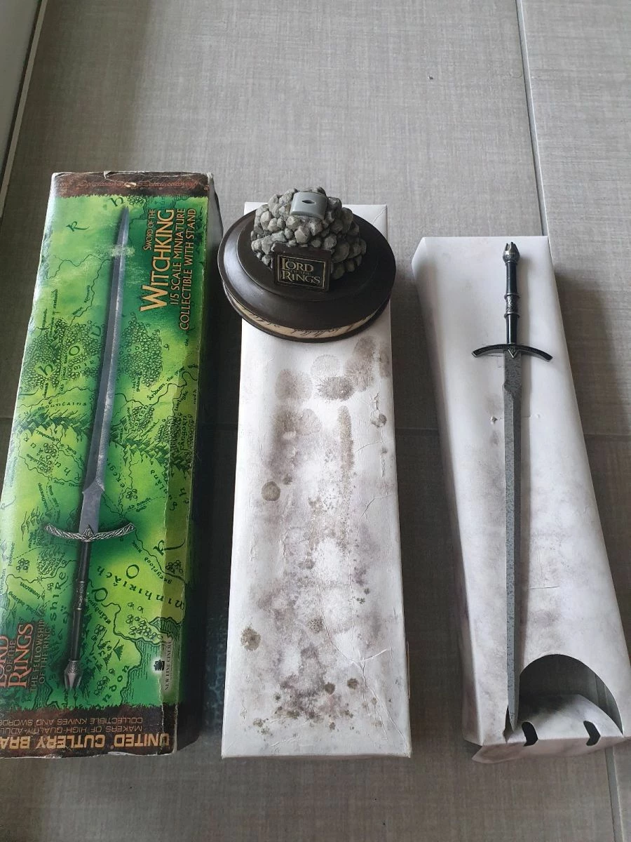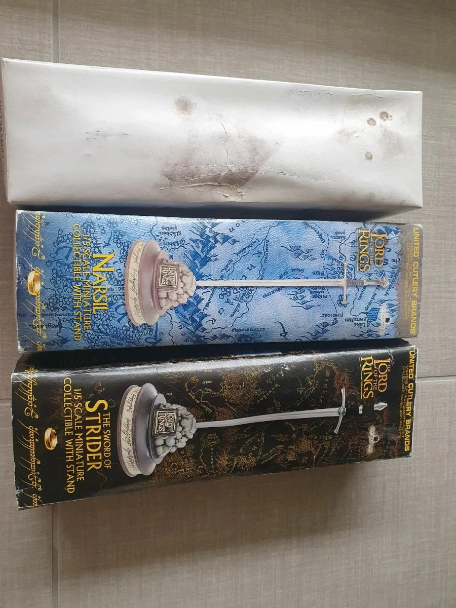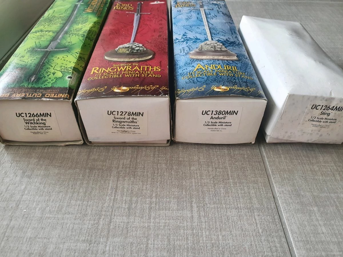LIMITED EDITION ORIGINAL LORD OF THE RINGS UNITED CUTLERY MINIATURE SWORDS. The products come from a private collection, so they are opened and used. From a smoke-free environment. Boxes were stored in a basement so they have some dark spots all over. Wear and tear signs on the boxes and some on the stands and swords. Please see photos carefully before buying. The stand of each sword is pre-assembled. I will be happy to provide you with more photos for each sword. No Returns! The bundle consists of: