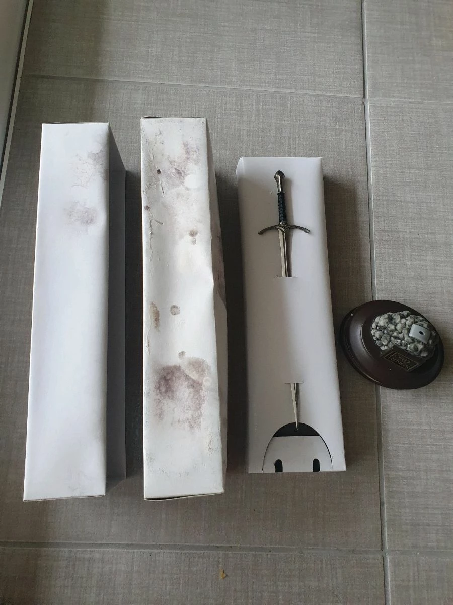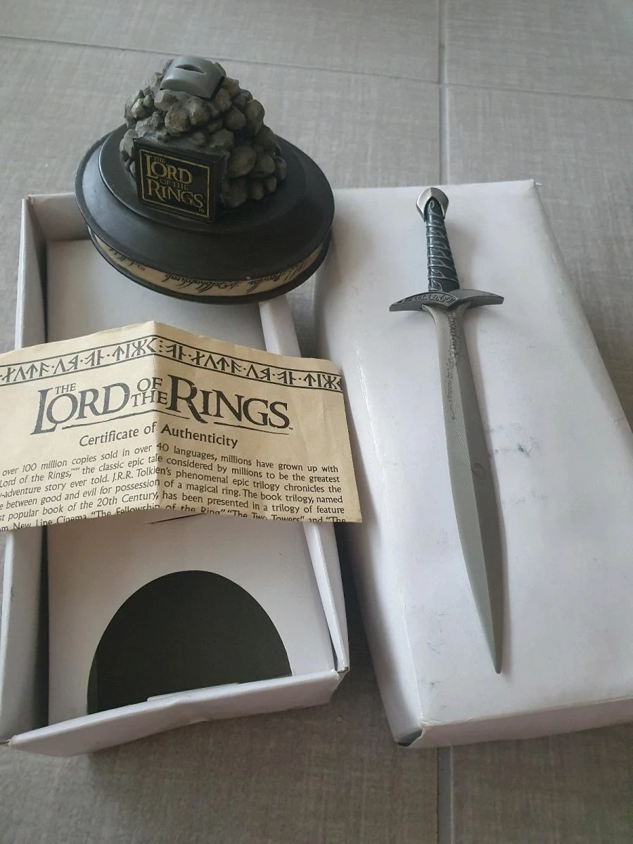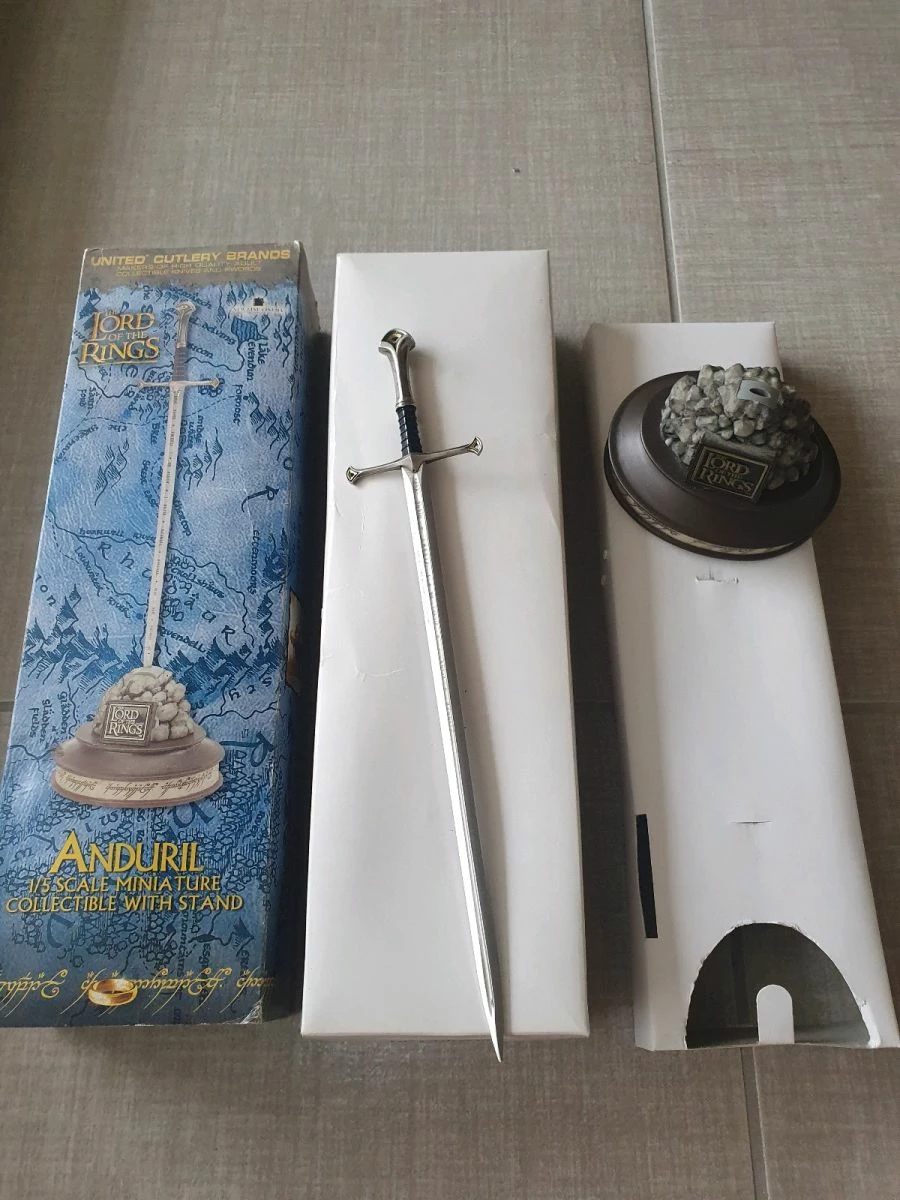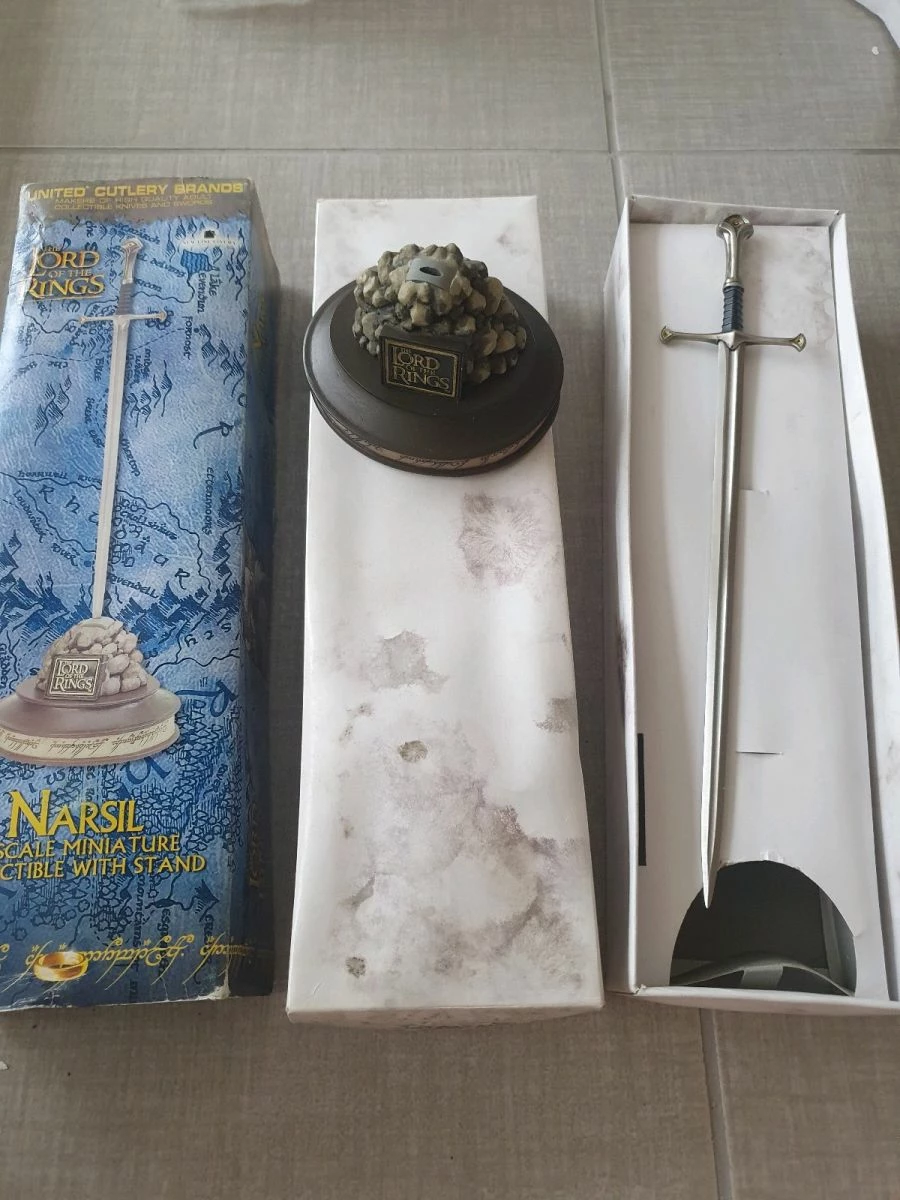 LIMITED EDITION ORIGINAL LORD OF THE RINGS UNITED CUTLERY MINIATURE SWORDS. The products come from a private collection, so they are opened and used. From a smoke-free environment. Boxes were stored in a basement so they have some dark spots all over. Wear and tear signs on the boxes and some on the stands and swords. Please see photos carefully before buying. The stand of each sword is pre-assembled. I will be happy to provide you with more photos for each sword. No Returns! The bundle consists of:
