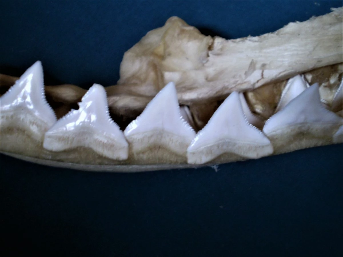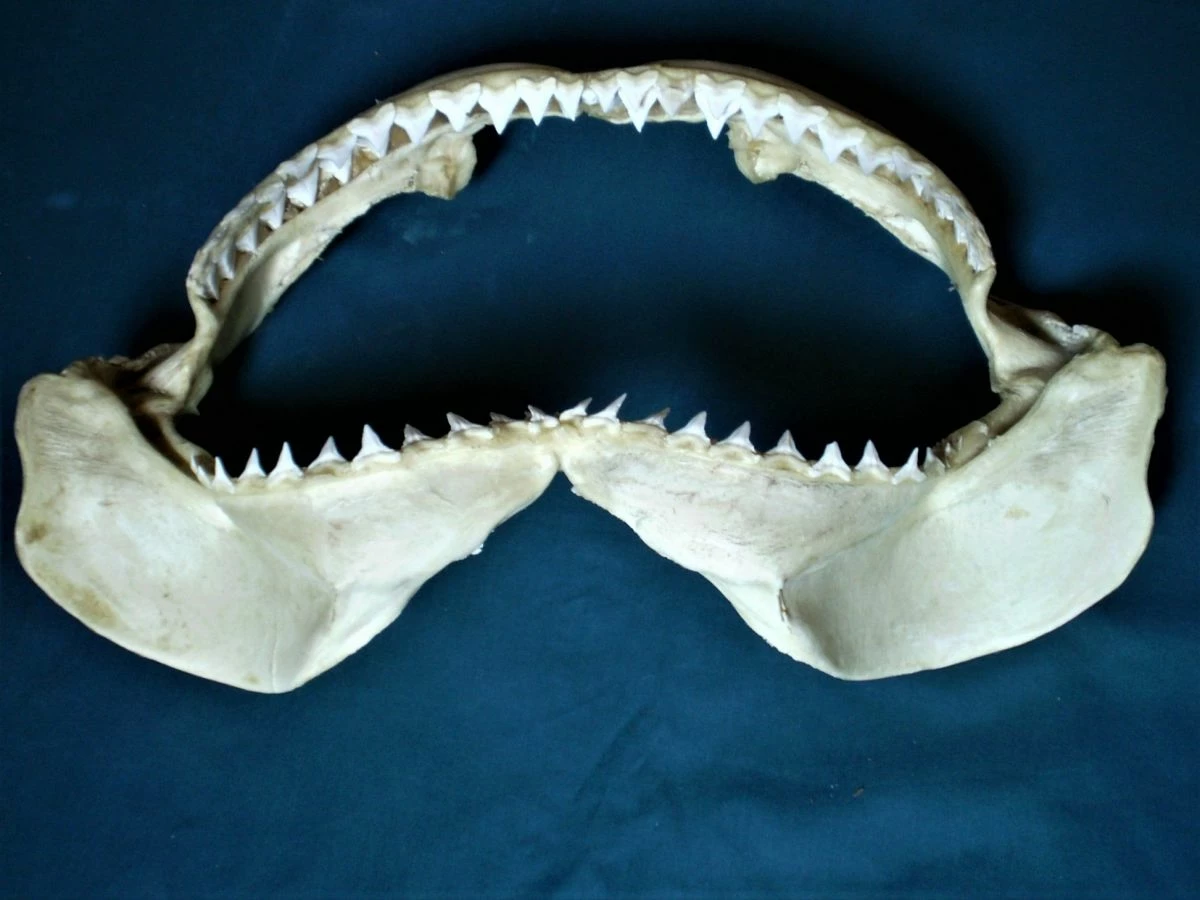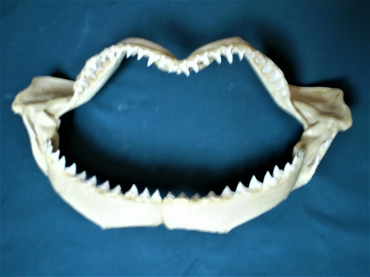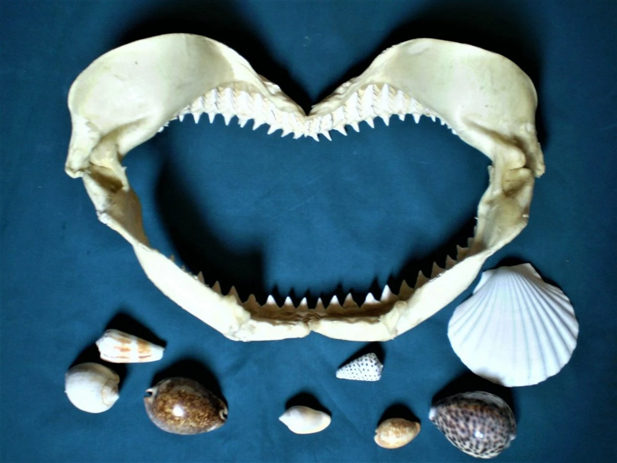 Πρόκειται για μία λευκή, μεγάλη σιαγόνα δοντιών μεγάλου καρχαρία. Η σιαγόνα έχει μήκος 44 cm, πλάτος 24 cm και βάρος 600 γραμμάρια. Είναι παλιά, σε άριστη κατάσταση, ιδανικό και ασυνήθιστο κομμάτι διακόσμησης οικιακού χώρου, βιτρίνας καταστήματος κλπ, σε πολύ χαμηλή τιμή! (Διευκρινίζεται ότι, μαζί με την σιαγόνα του καρχαρία θα στείλω στον αγοραστή και τα οκτώ κοχύλια της φωτογραφίας ως δώρο!).