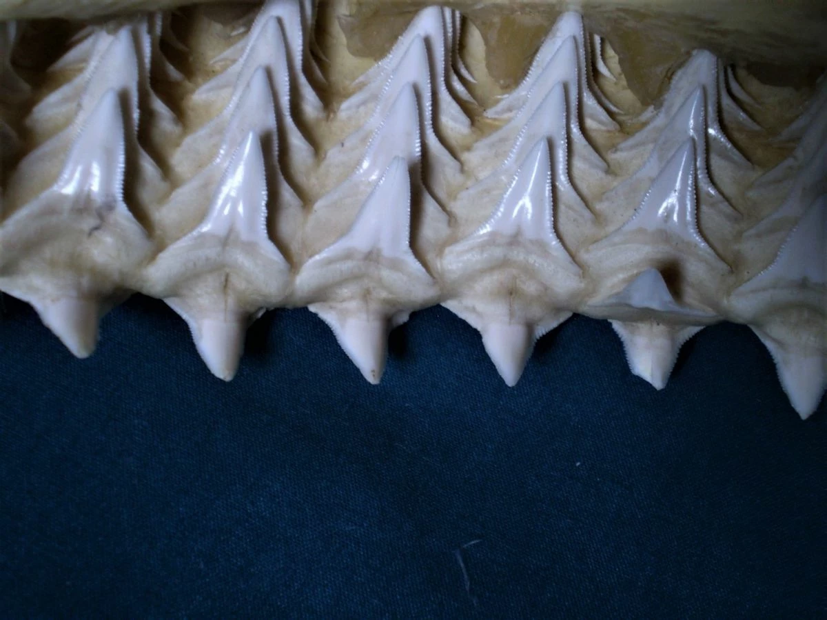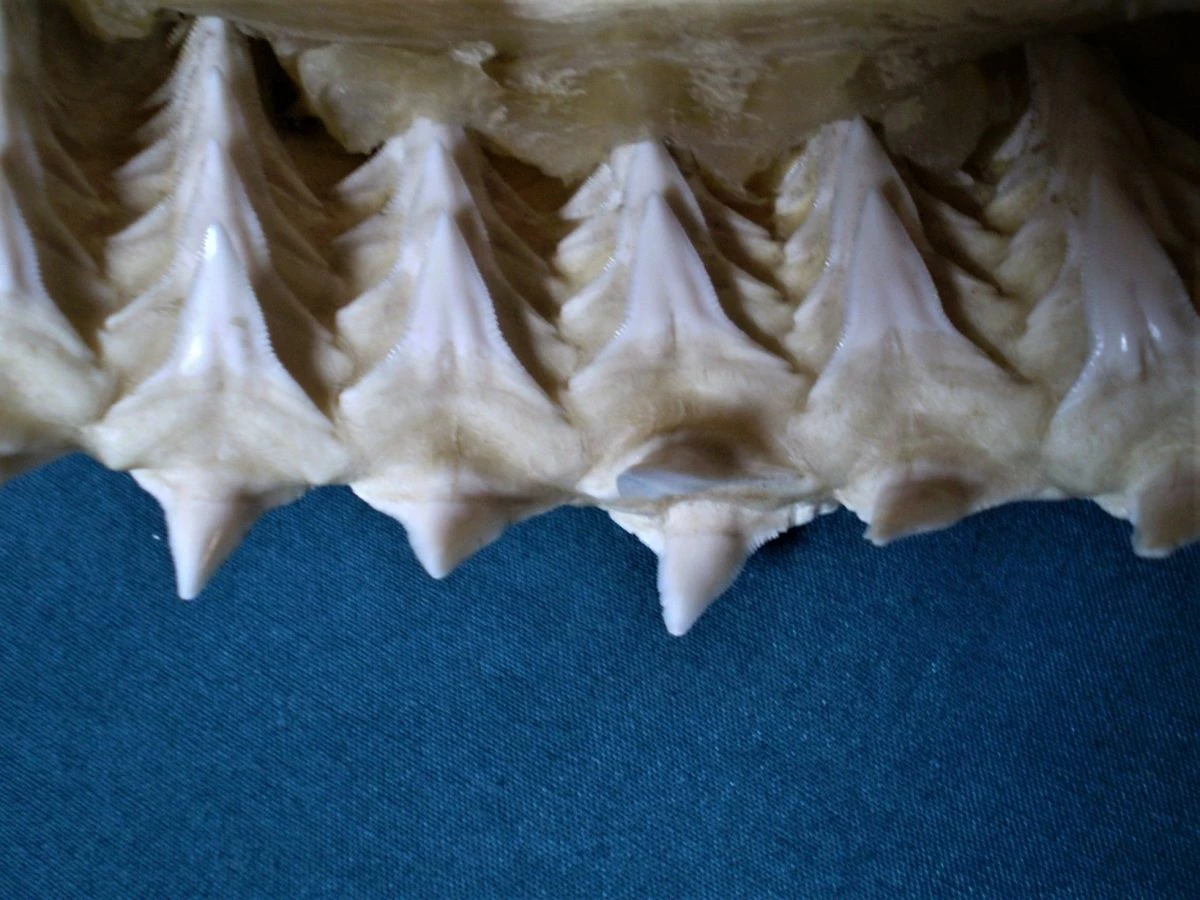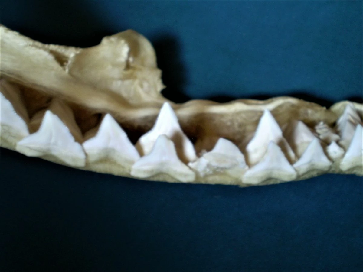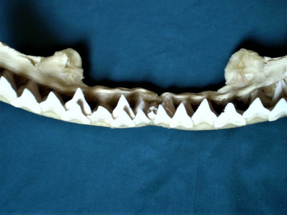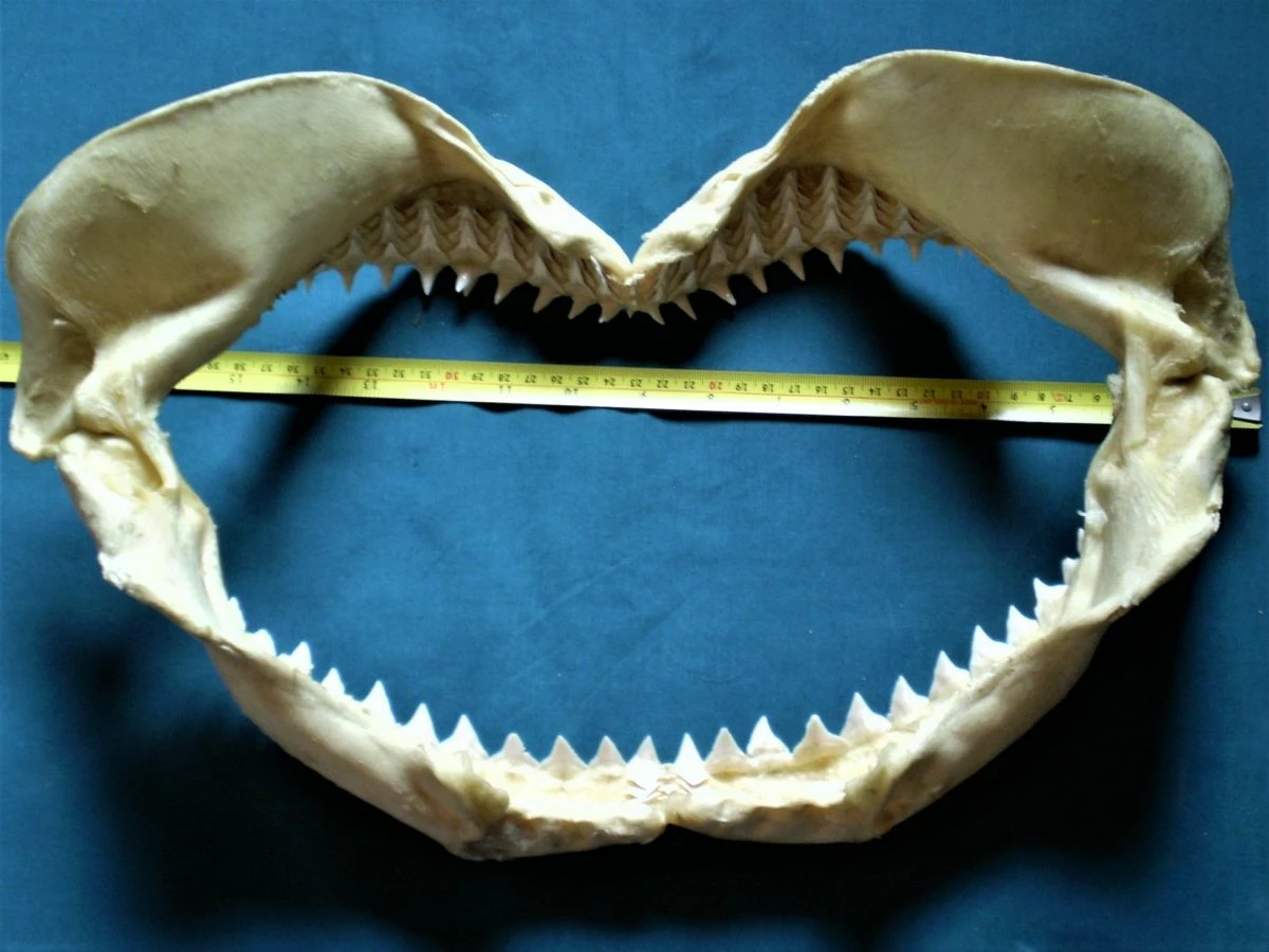 Πρόκειται για μία λευκή, μεγάλη σιαγόνα δοντιών μεγάλου καρχαρία. Η σιαγόνα έχει μήκος 44 cm, πλάτος 24 cm και βάρος 600 γραμμάρια. Είναι παλιά, σε άριστη κατάσταση, ιδανικό και ασυνήθιστο κομμάτι διακόσμησης οικιακού χώρου, βιτρίνας καταστήματος κλπ, σε πολύ χαμηλή τιμή! (Διευκρινίζεται ότι, μαζί με την σιαγόνα του καρχαρία θα στείλω στον αγοραστή και τα οκτώ κοχύλια της φωτογραφίας ως δώρο!).