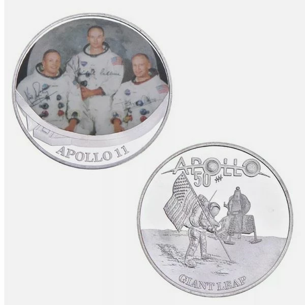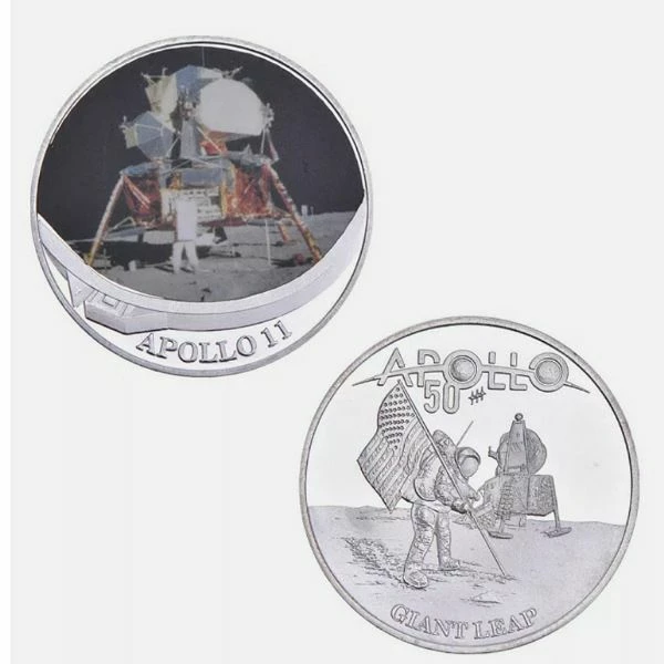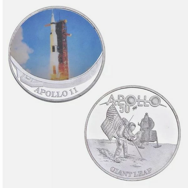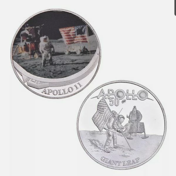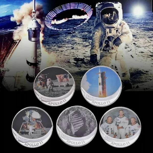Συλλεκτικά κομμάτια αναμνηστικά 5 τεμάχια με θέμα την προσεδάφιση του Apollo 11 στο φεγγάρι, για τα 50 χρόνια 1969-2019, επάργυρα βαθμών 0.999 μαζί με θήκες κάψουλες. Μέγεθος διαμέτρου 40mm και πάχος 3mm. Τιμή 150
