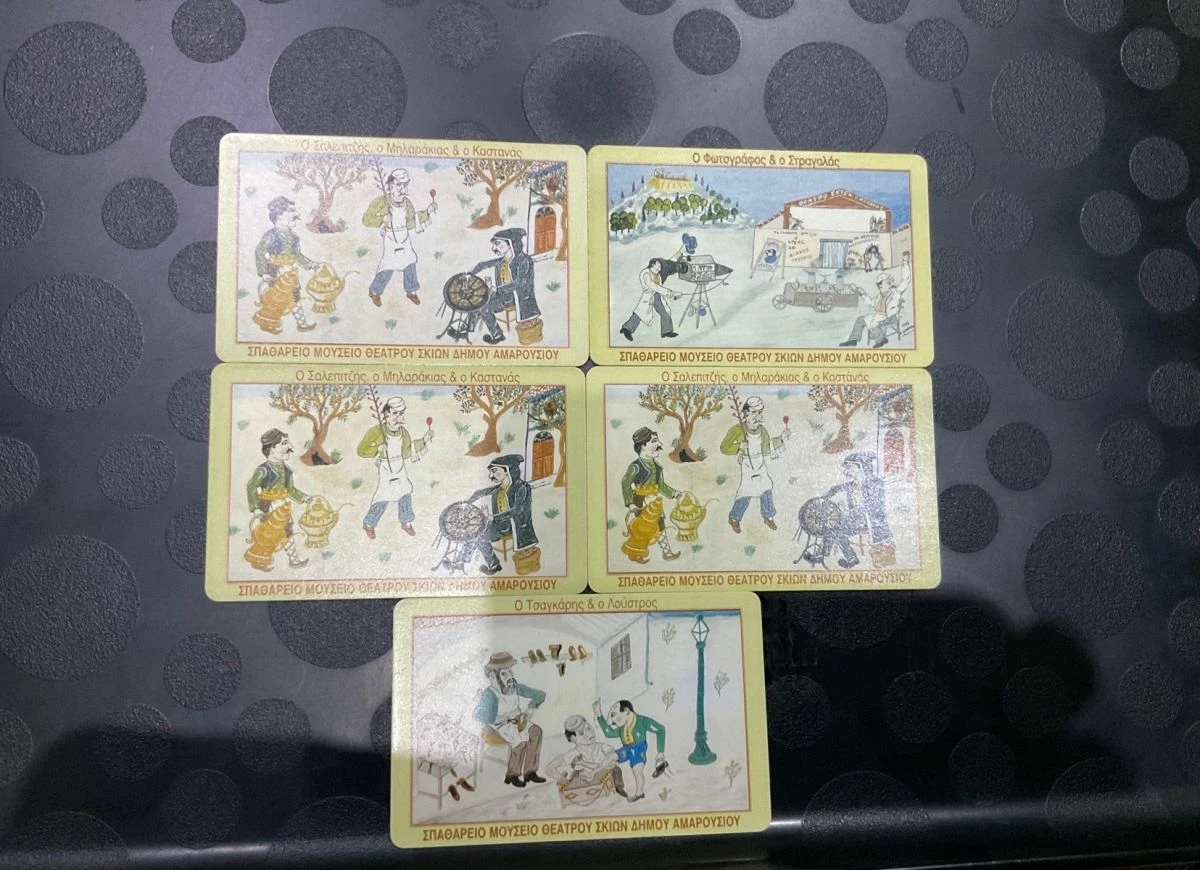 5 Σπάνιες τηλεκάρτες του Σπαθαρειου Μουσείου θεάτρου Σκιών δήμου Αμαρούσιου που απεικονίζουν τον Καστανα, Σαλεπτζης, Στραγαλας, Μηλαρακιας, Λούστρος