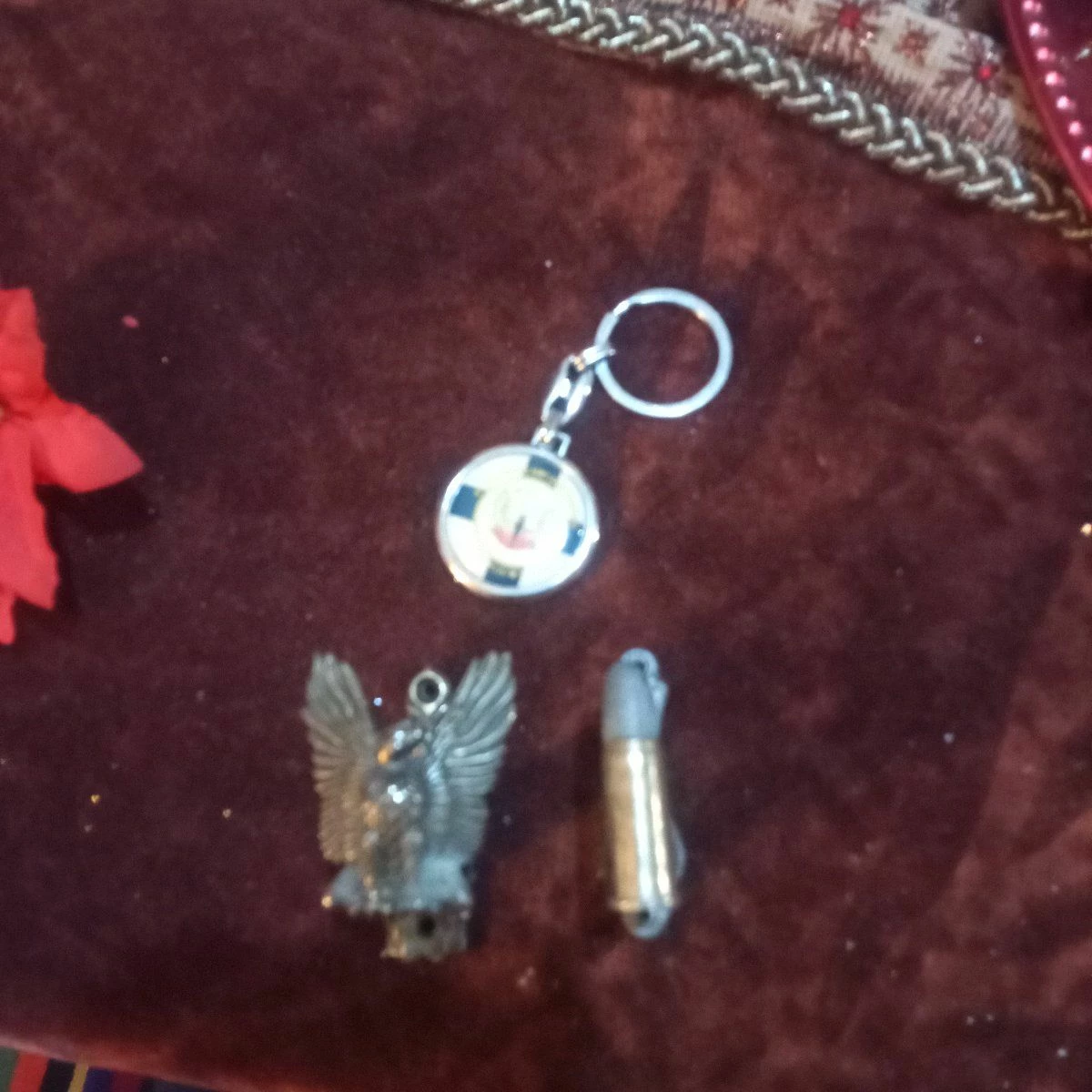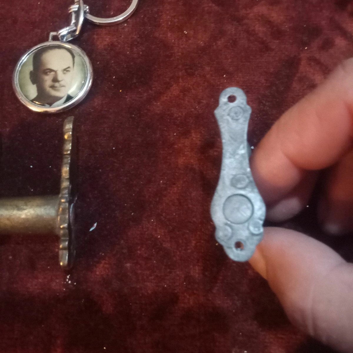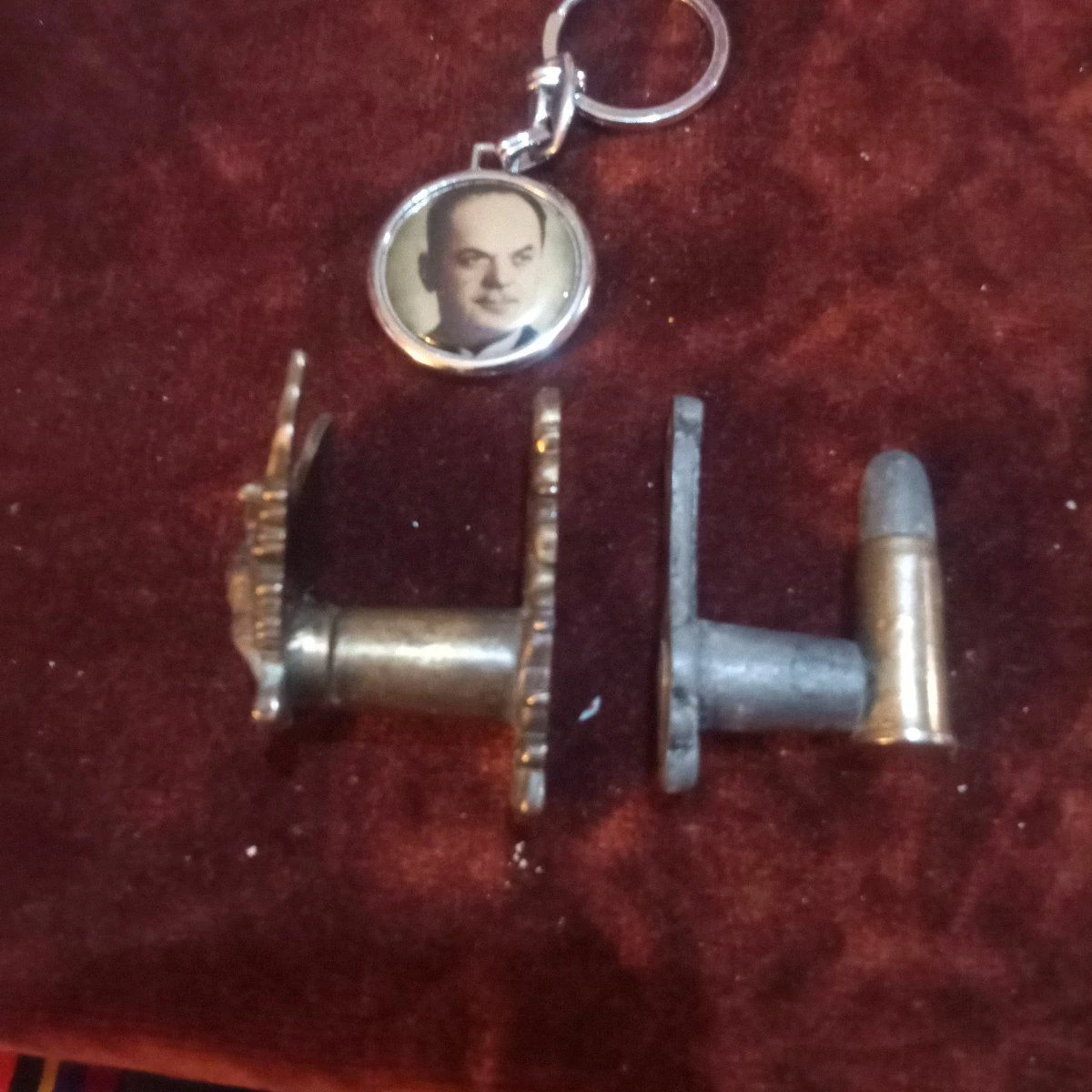 το σετ περιλαμβάνει μπρελόκ Παπαδόπουλος και ένα σετ κρεμαστρες μικρές λέγετε τα είχαν στα αστυνομικά τμήματα η μία παρομοιάζει το πουλί επεν και η άλλη μια σφαίρα