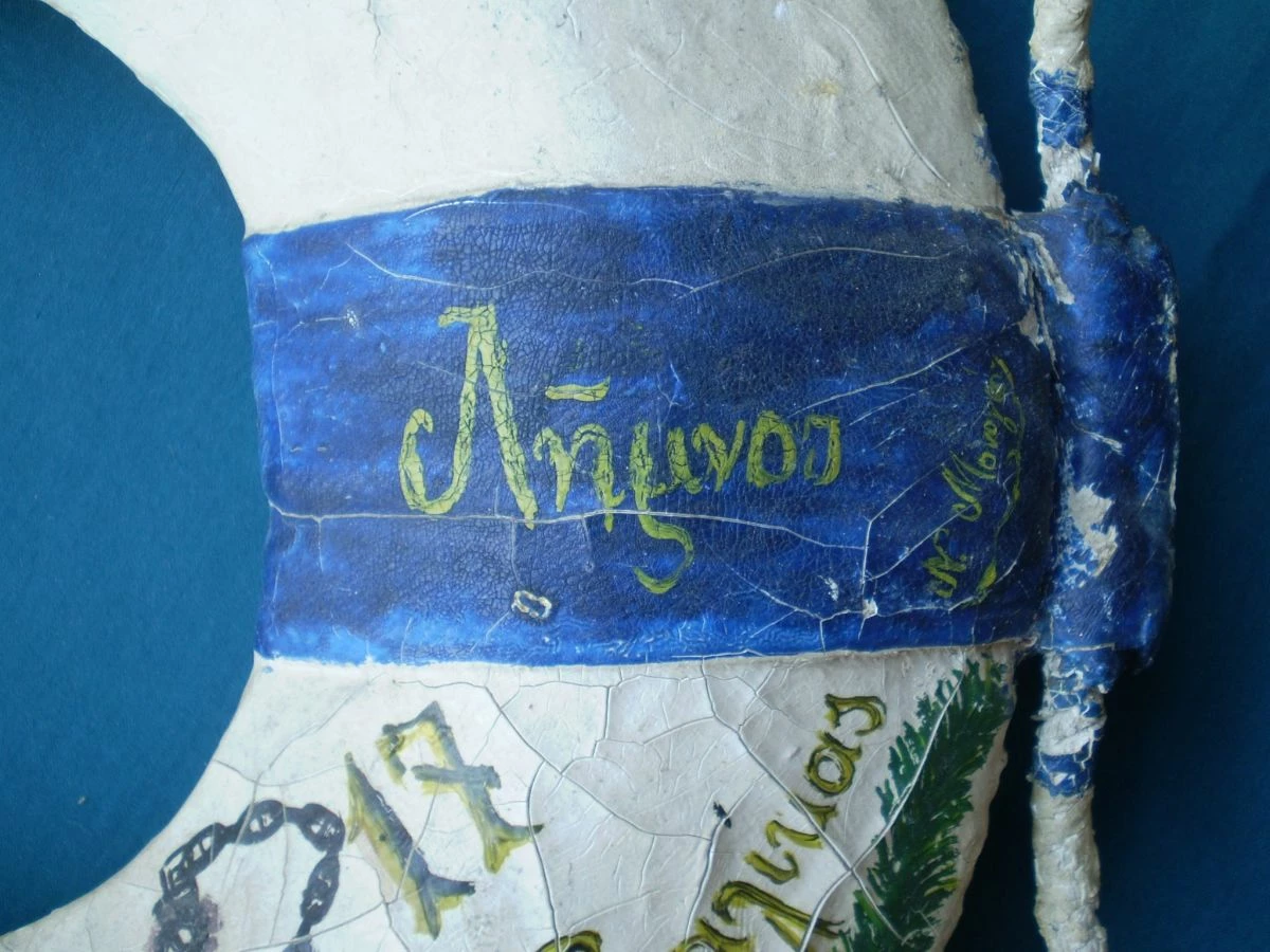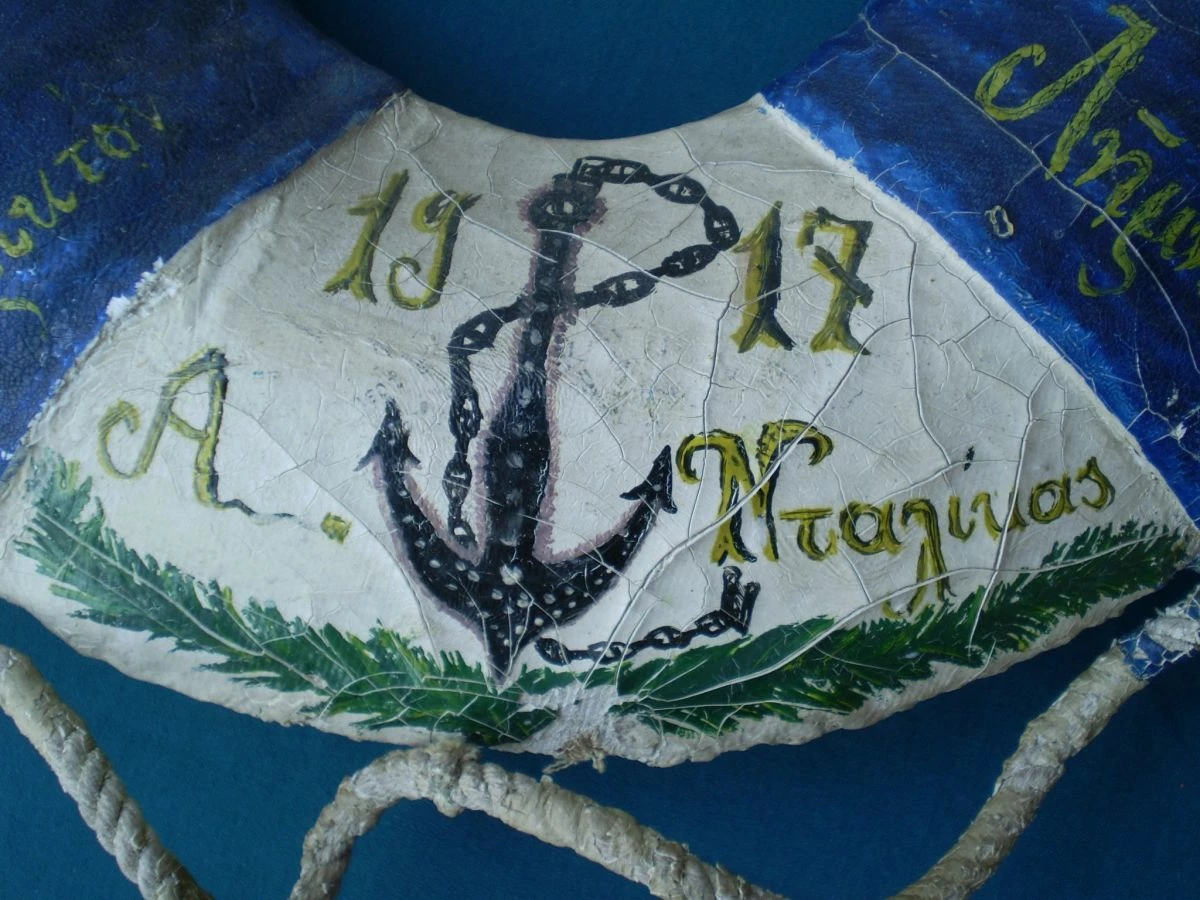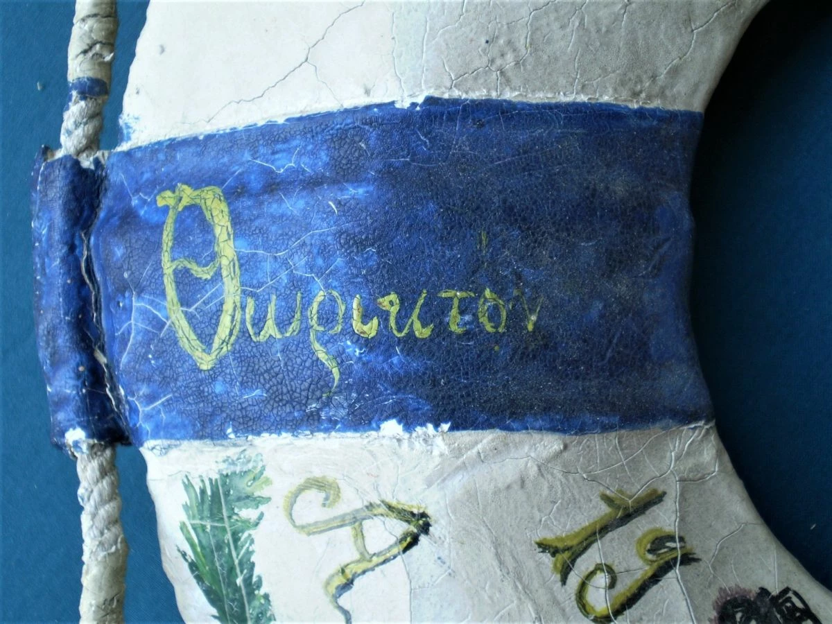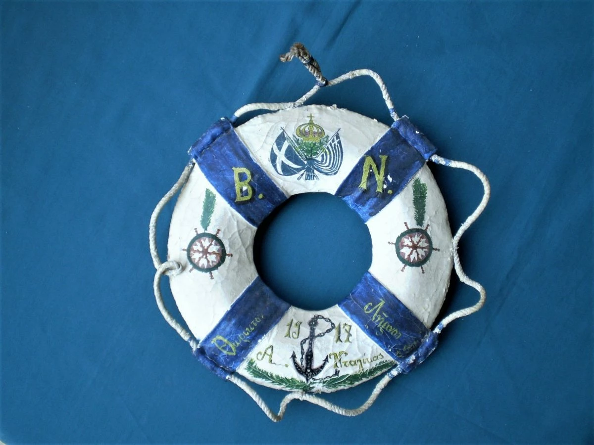 Πρόκειται για σπάνια, όμορφη και συλλεκτική ναυτική αντίκα, ιστορικής σημασίας, του Α΄ Παγκοσμίου Πολέμου, ζωγραφισμένη στο χέρι, μικρό σωσίβιο με εξαίσια διακοσμητικά ναυτικά στοιχεία, με υπογραφή και ημερομηνία 1917. Αυτό το κομμάτι ήταν τοποθετημένο στο ιστορικό θωρηκτό “ΛΗΜΝΟΣ” του Ελληνικού Βασιλικού Ναυτικού (Β.Ν) ως διακοσμητικό στοιχείο. Το υλικό του είναι σκληρό, ή από ξύλο ή κάποιο είδος πλαστικού. Διάμετρος 30 cm και βάρος 430 gr. Εχει διατηρηθεί σε πολύ καλή κατάσταση, με ελάχιστη φθορά, αναμενόμενη για αντίκα 106 ετών. Ιδανικό κομμάτι για συλλογή και διακόσμηση.