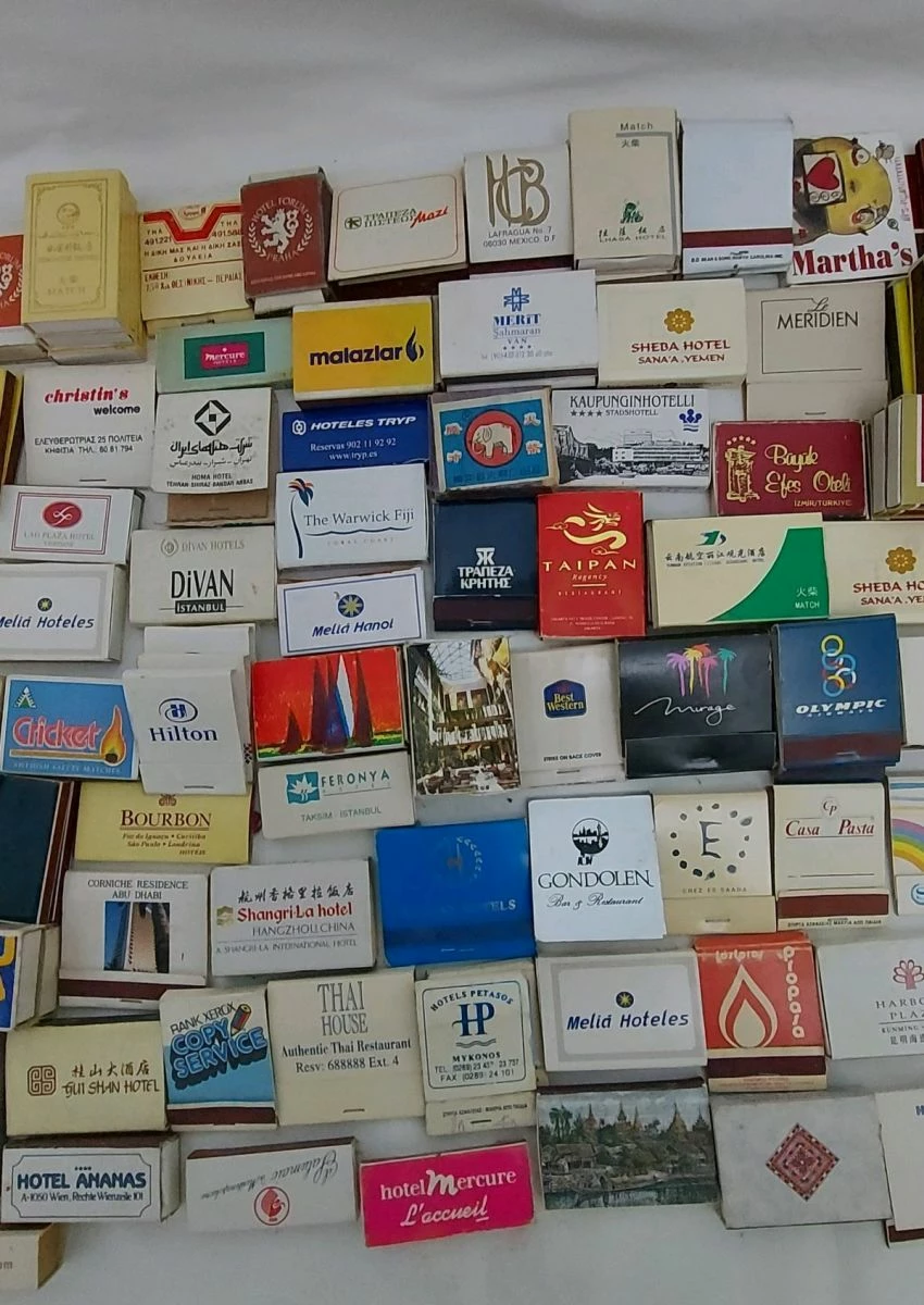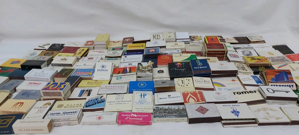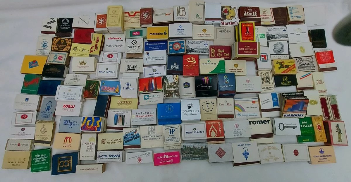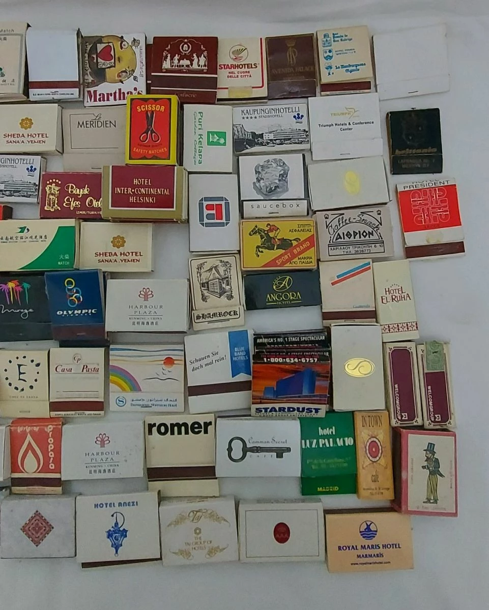 διάφορα σπιρτόκουτα από διάφορες χώρες και ξενοδοχεία του κόσμου. 159 σύνολο. 3 δεν έχουν το εσωτερικό κουτί τους. τα περισσότερα είναι γεμάτα και κάποια έχουν μειωμένα σπίρτα.κάποια είναι διπλά και τριπλά