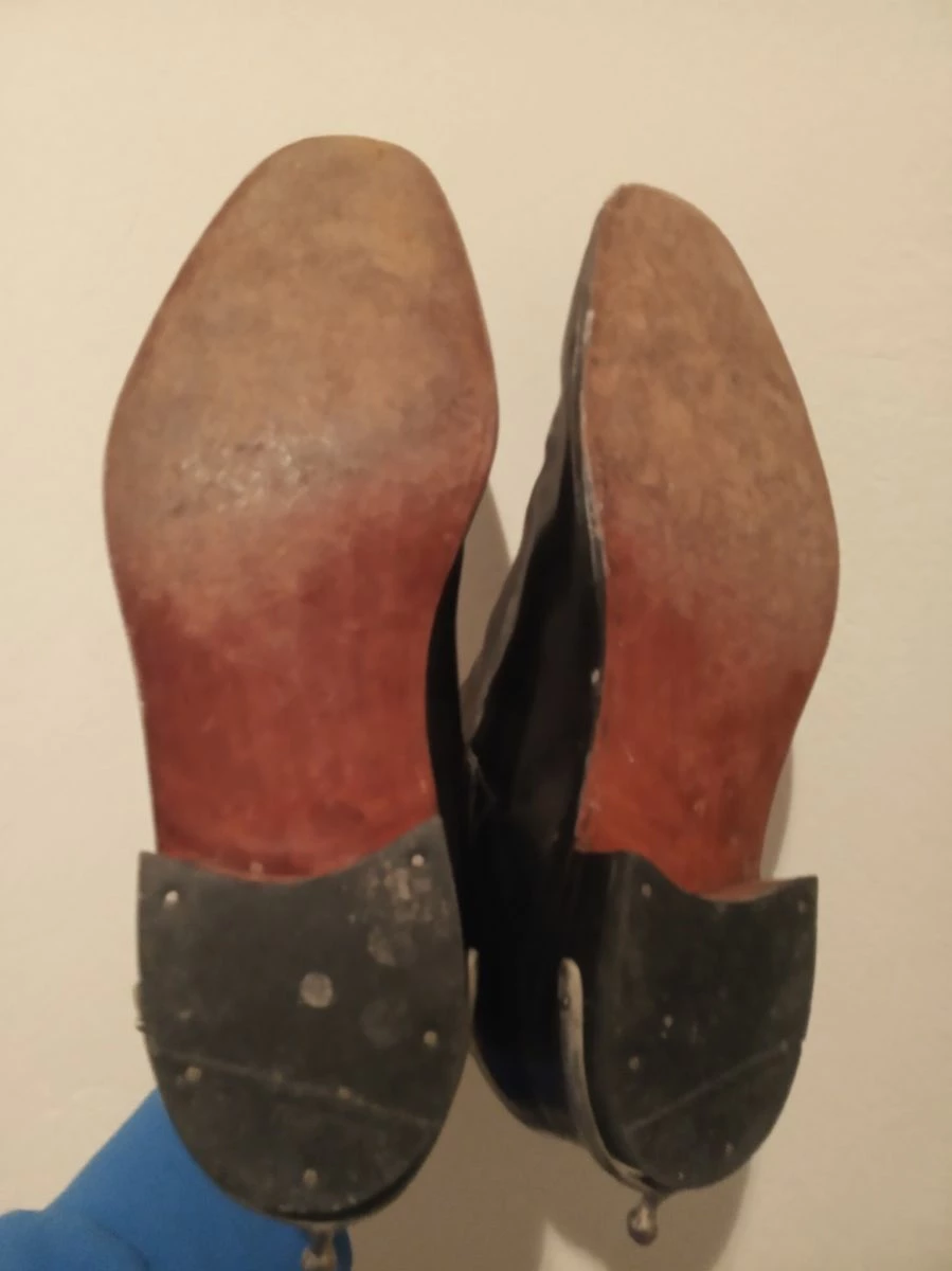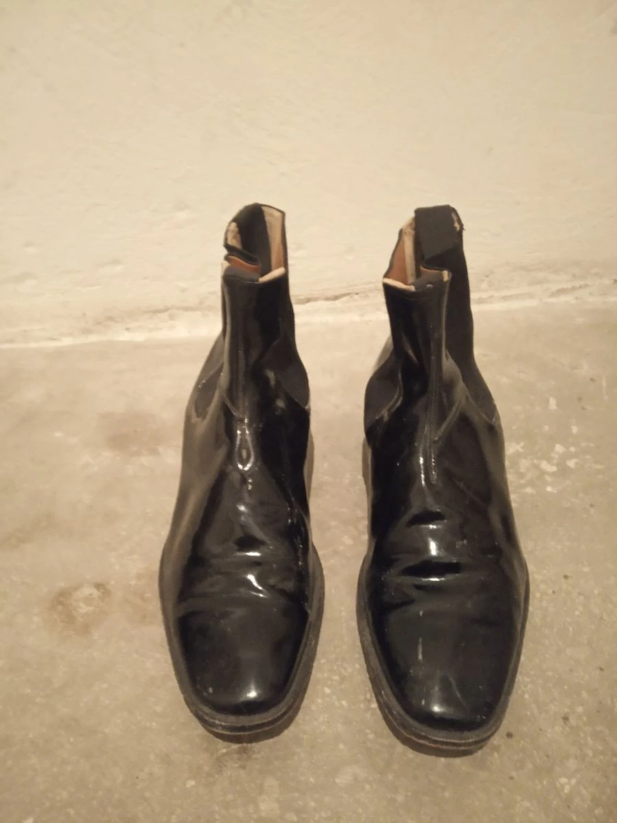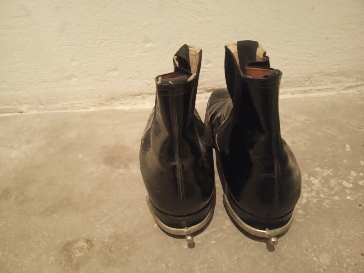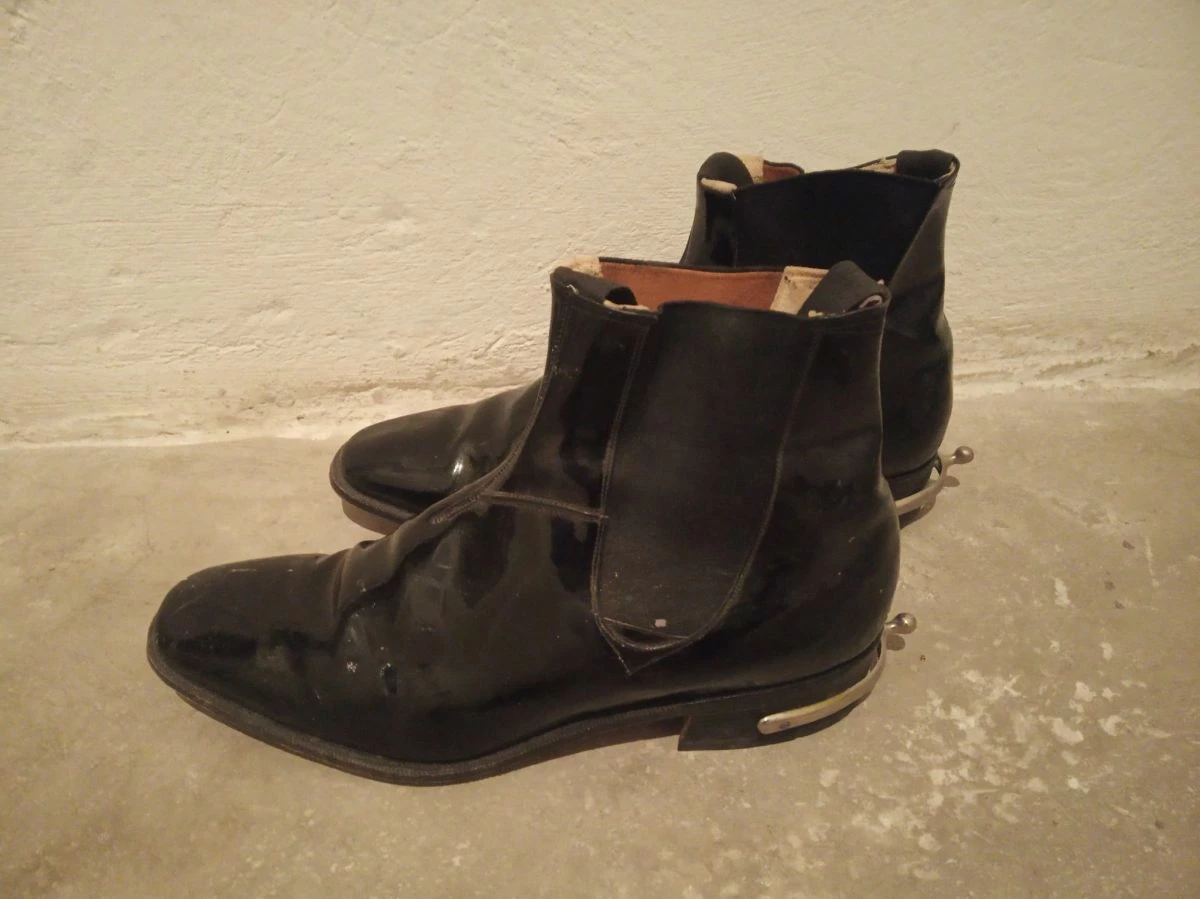 Πωλείται το εικονιζόμενο ζευγάρι λουστρινια – στρατιωτικά στιβαλια, εποχής. Με ενσωματωμένα σπιρουνια στα τακούνια και λάστιχο στο πλάι, αποτελούν τμήμα επίσημης στολής του στρατού. Σε άριστη κατάσταση, ιδανικά για συμπλήρωση συλλογής στολής.