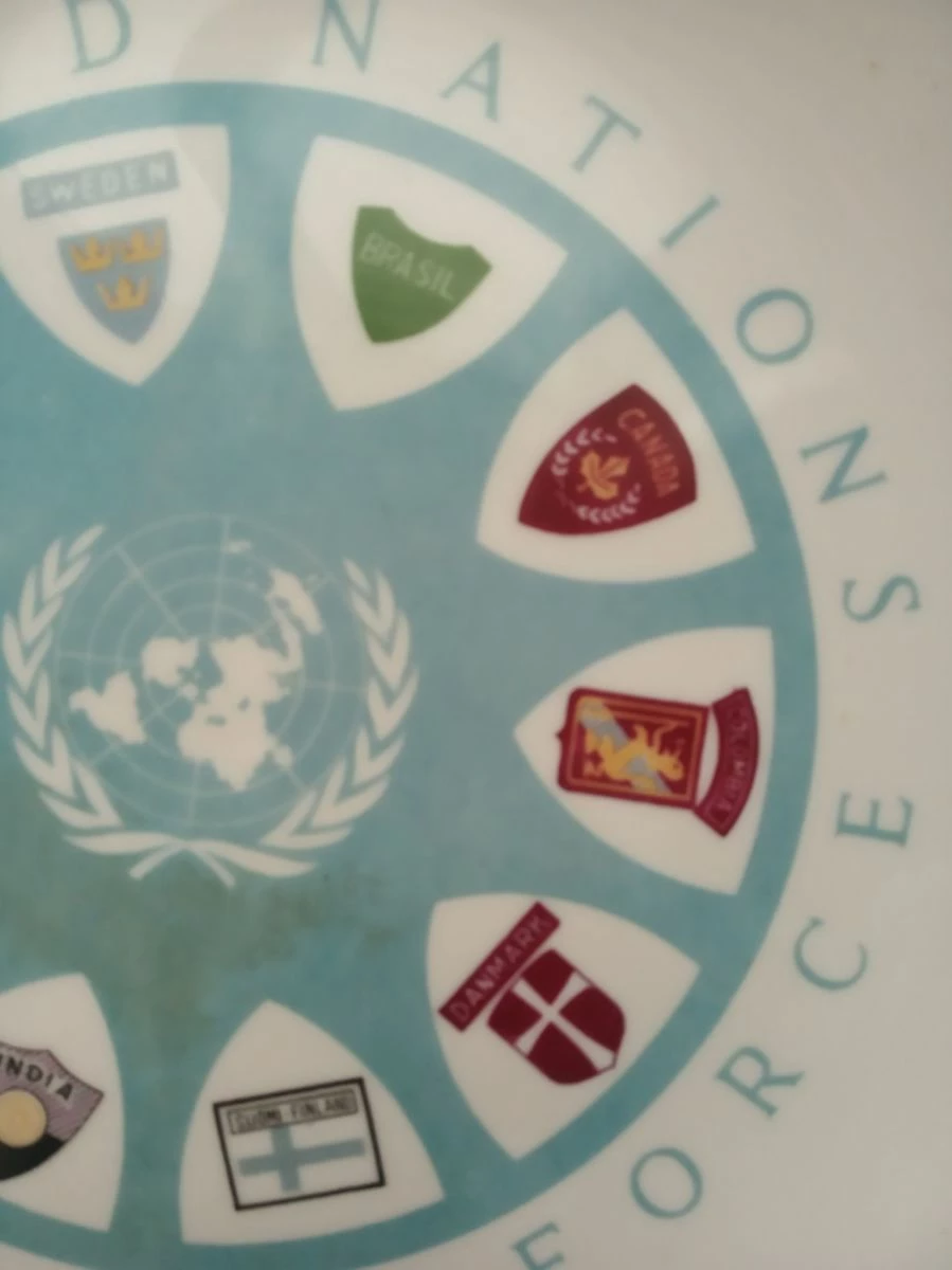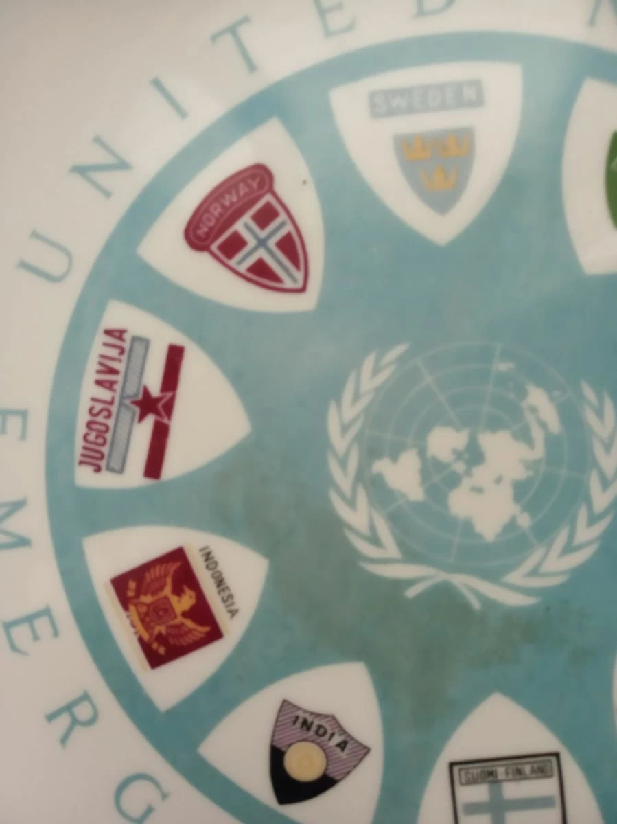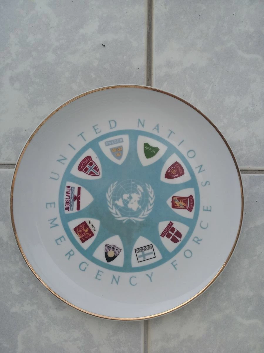 Πωλείται το εικονιζόμενο πιάτο UNITED NATIONS EMERGENCY FORCE. Αναφέρεται στην κρίση και τον πόλεμο του Σουέζ που έγινε το 1956, και εικονιζονται τα εμβλήματα των 10 χωρών που έστειλαν στρατεύματα, και που απετέλεσαν την 1η UNITED NATIONS EMERGENCY FORCE, κάτι που έγινε για 1η φορά. (Μεταξύ των οποίων, και μιας χώρας που δεν υπάρχει πια: Γιουγκοσλαβία). Οι δυνάμεις αυτές, 6,000 ανδρών κατά το μάξιμουμ της παρουσίας της, επεχείρησαν μεταξύ Νοεμβρίου 1956 και Μαίου 1967. Διαμ. 27 εκ. και σε άριστη κατάσταση.