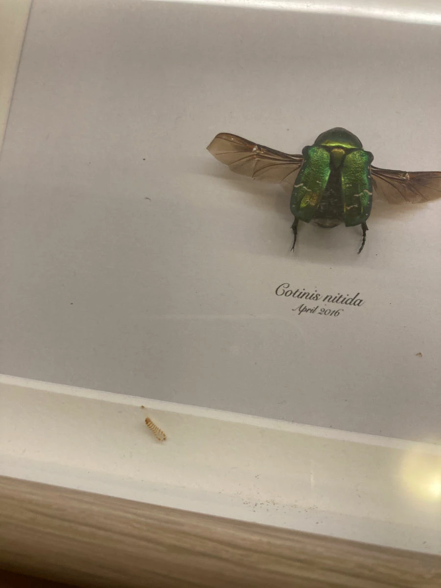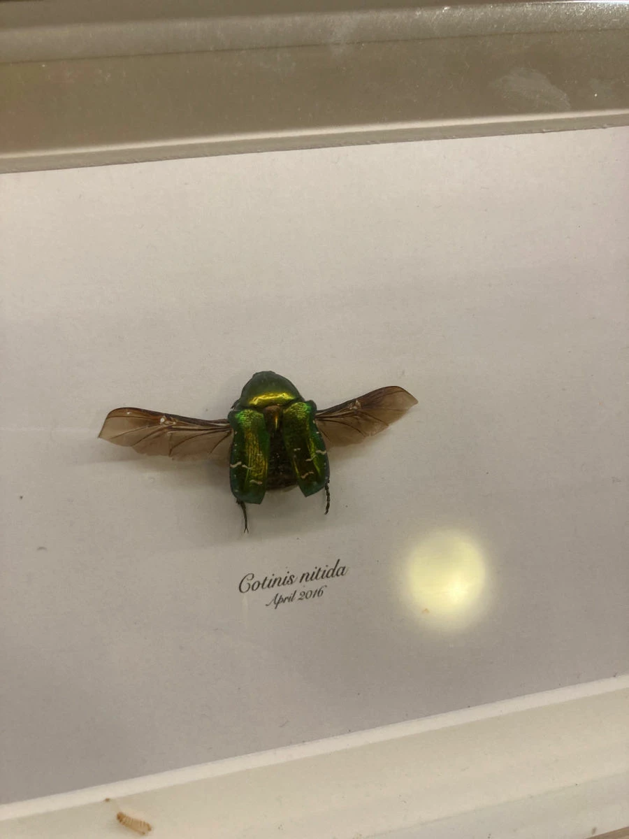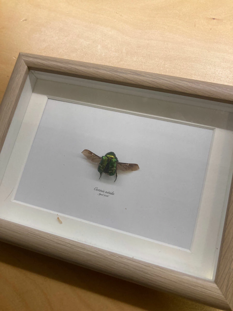 Βαλσαμωμένη χρυσόμυγα, σε ξύλινο Καδρό διαστάσεων 20 επί 14. Υπάρχει μάλλον παλιότερη προσβολή από κάποιο έντομο γιατι έχει και μια έκδυση προνύμφης μέσα στο κάδρο