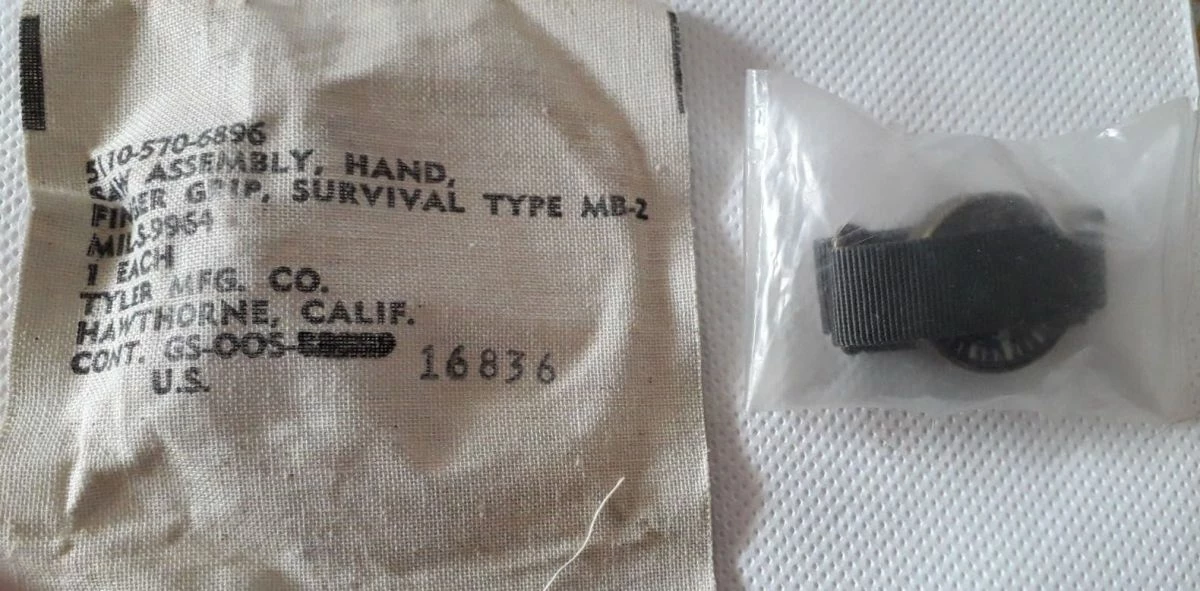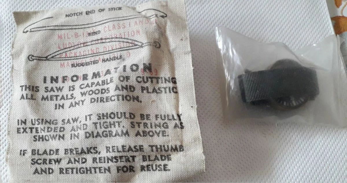 WW II U.S.A.F. Pilots Wrist Compass and Escape Saw Assembly (finger grip) Unopened -both sealed. Πυξίδα χειρός ( καρπού)και πριόνι διαφυγής ( κόβει ξύλο και μέταλλο) απο κίτ επιβίωσης του ΒΠΠ Αμερικανών πιλότων . Κλειστά και Αμεταχείριστα . Η φωτογραφία με ανοιχτή την πυξίδα, έχει αλιευθεί από το φόρουμ usmilitariaforum.com Ώρες επικοινωνίας από 10:00 έως 22:00